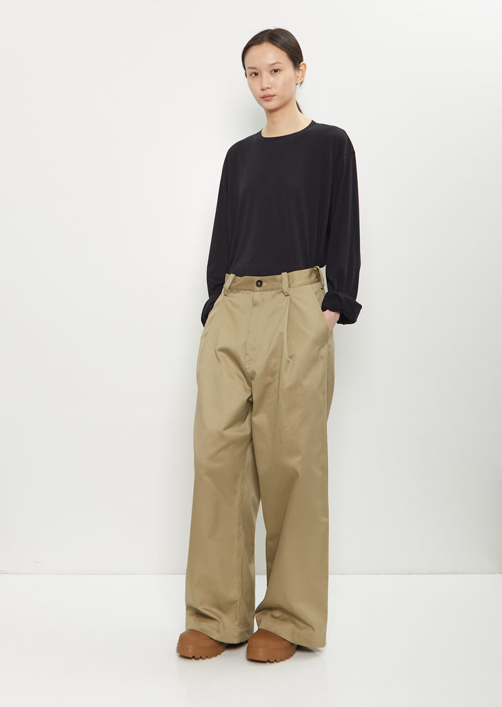 Sofie D'Hoore beige signature relaxed pant with straight, wide legs and front pleats in cotton twill. Features darts at back, belt loops, angled side pockets, a single patch pocket at back, and a concealed button-fly fastening with a single visible button at waist. Finished with dark horn-hued buttons.