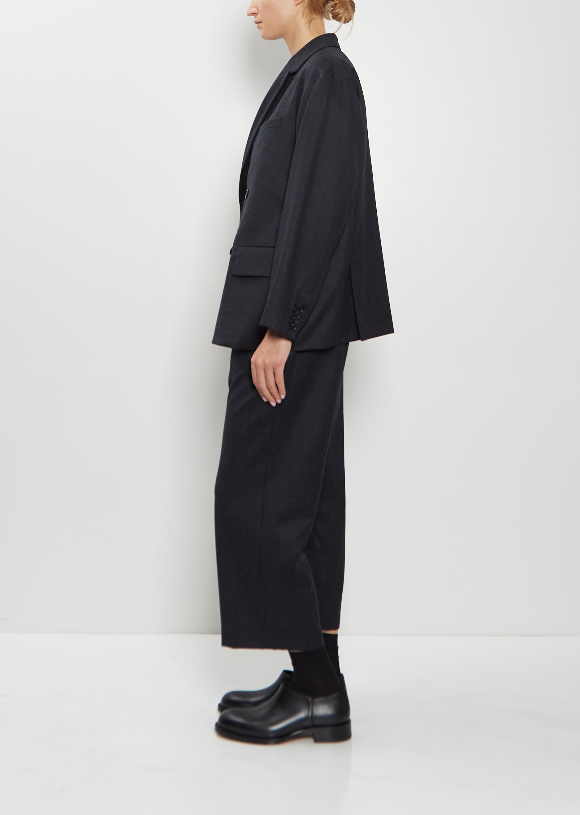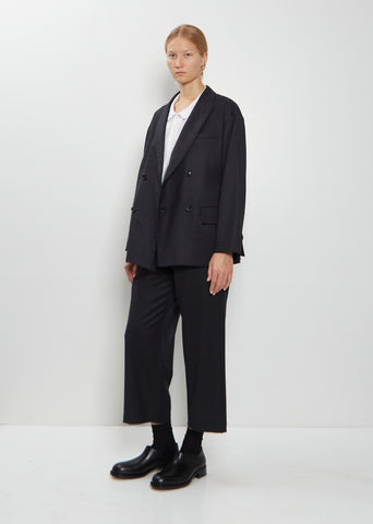 Toujours charcoal double breasted jacket with notched lapels and tonal button front in a lightweight wool twill. Features a button hole detail at lapel, chest welt pocket, front flap welt pockets, buttoned cuffs, double vent at back, and an interior slip pocket. Body lined in off white cotton, and sleeves lined in tonal cupro.
