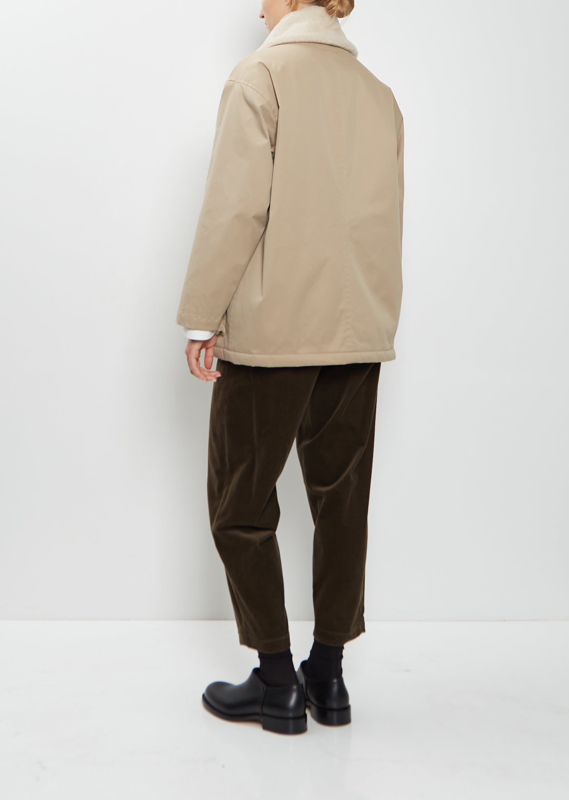 Toujours khaki high neck jacket with a wool and silk blend shearling lining in a crisp cotton blend twill. Features dropped shoulders, front flap patch pockets and a press button front closure. Sleeves lined in tonal cupro.