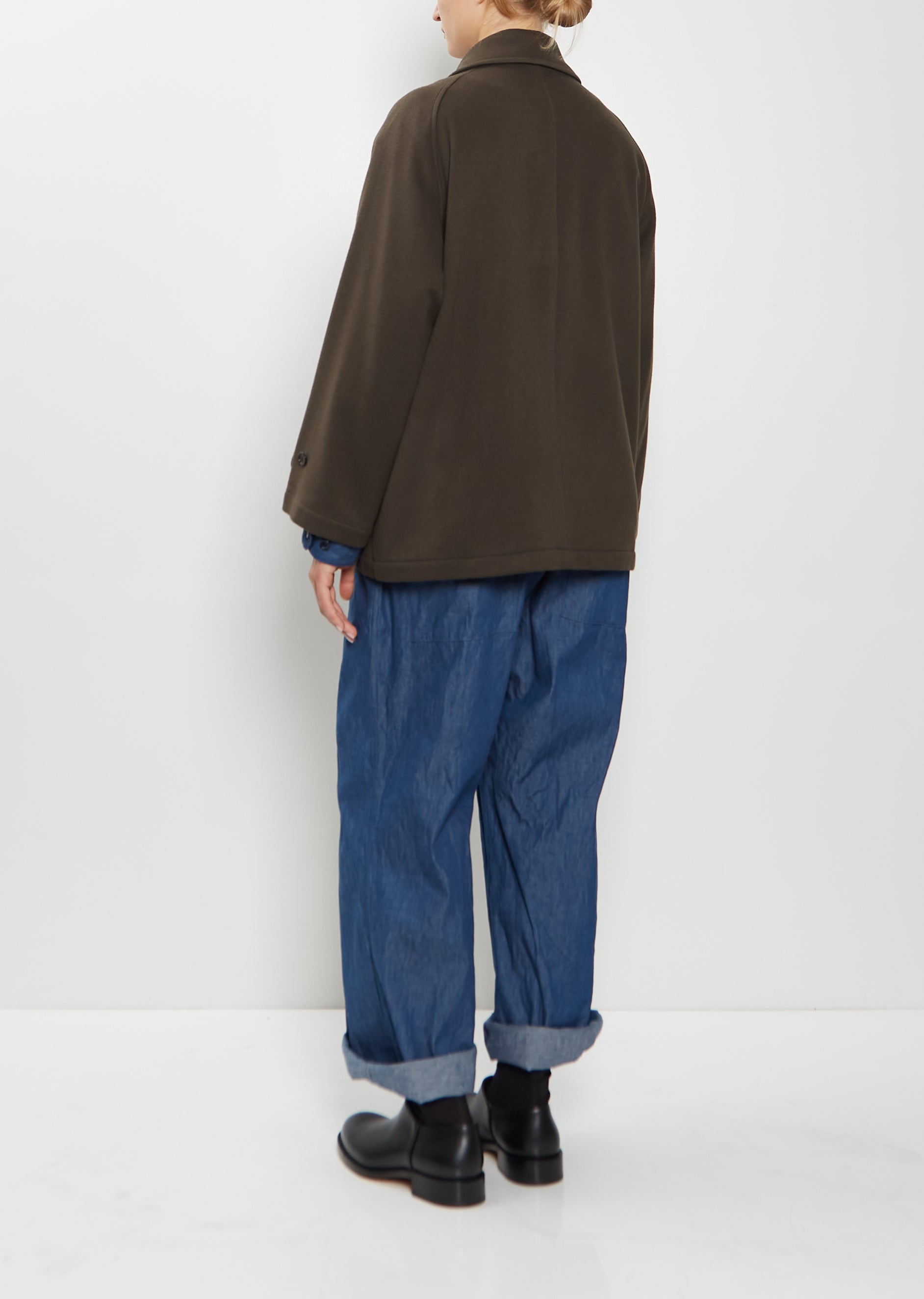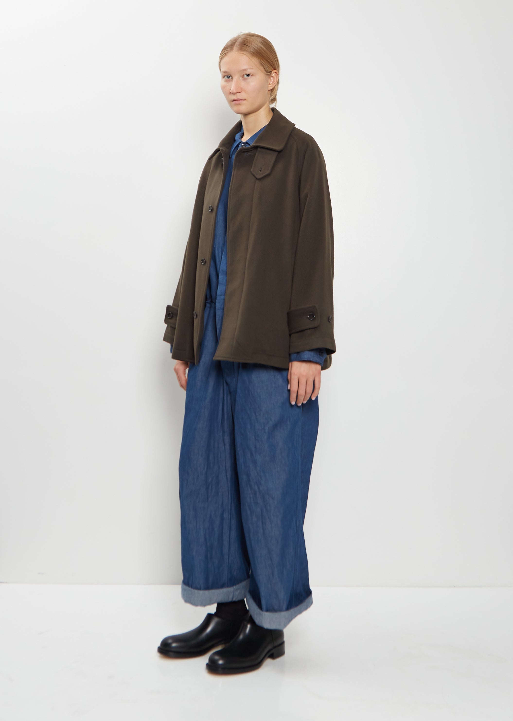 Toujours chestnut brown coat with a spread collar and concealed button front in a felted wool and cashmere blend. Features a button tab at neck, single visible exposed button at neck, raglan sleeves, adjustable button tab sleeves, welt pockets, and an interior patch pocket. Body lined in tonal cotton silk blend, sleeves lined in tonal cupro.