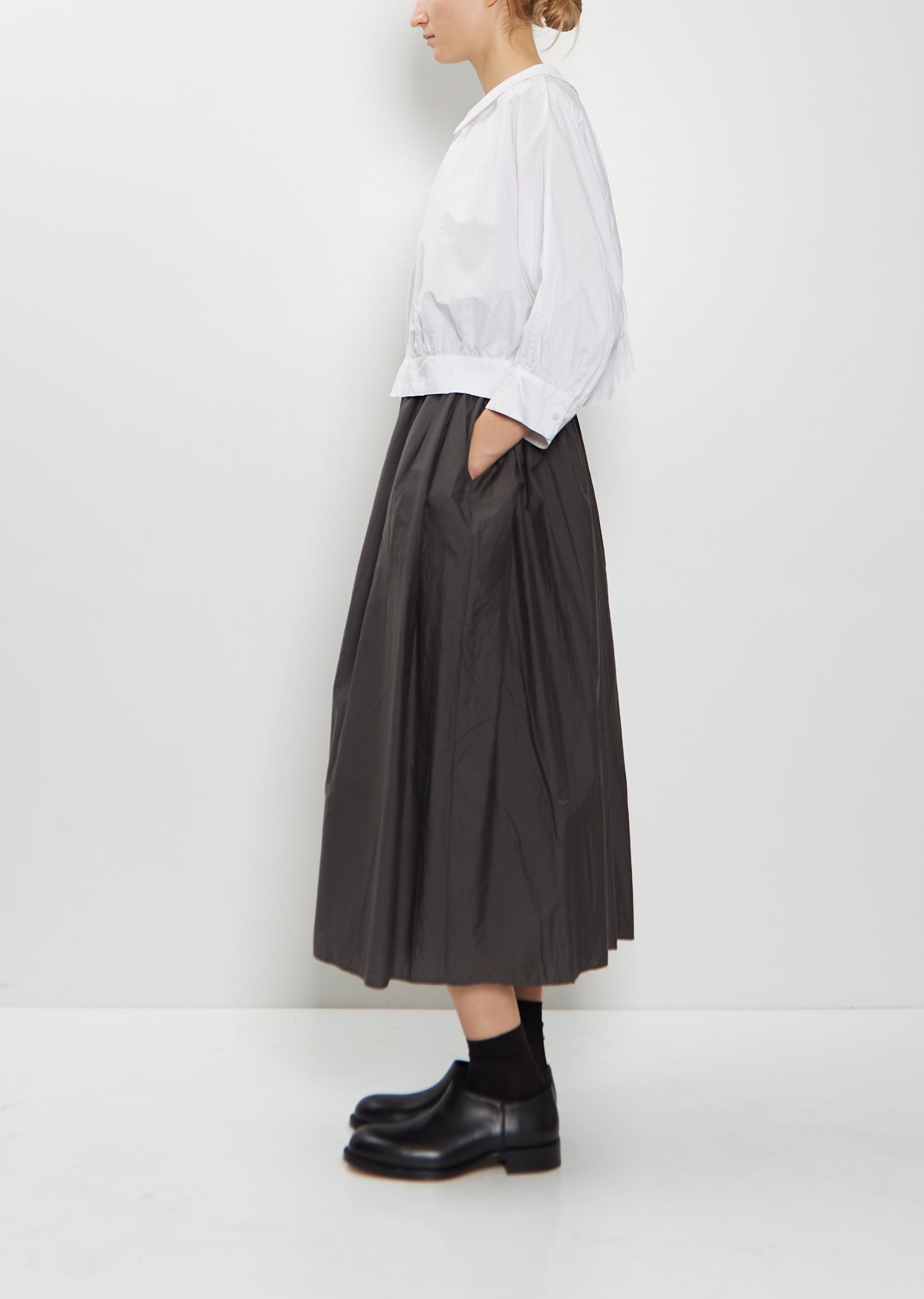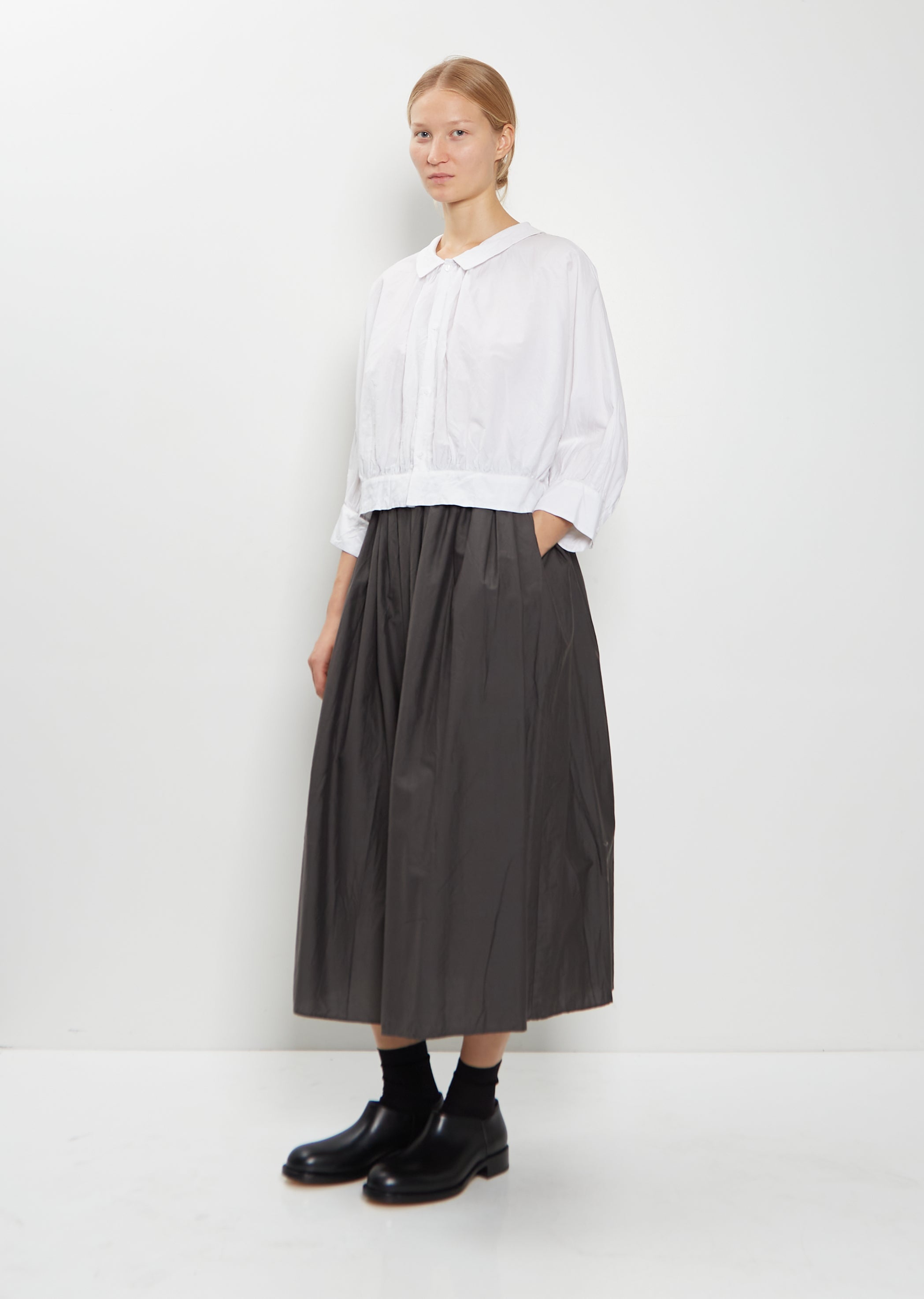 Toujours smoke white cropped blouse with a bolero collar and tonal button front in a smooth cotton and silk blend. Features dolman sleeves, gathering details along hem and cuffs, buttoned cuffs.