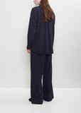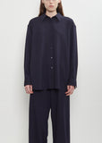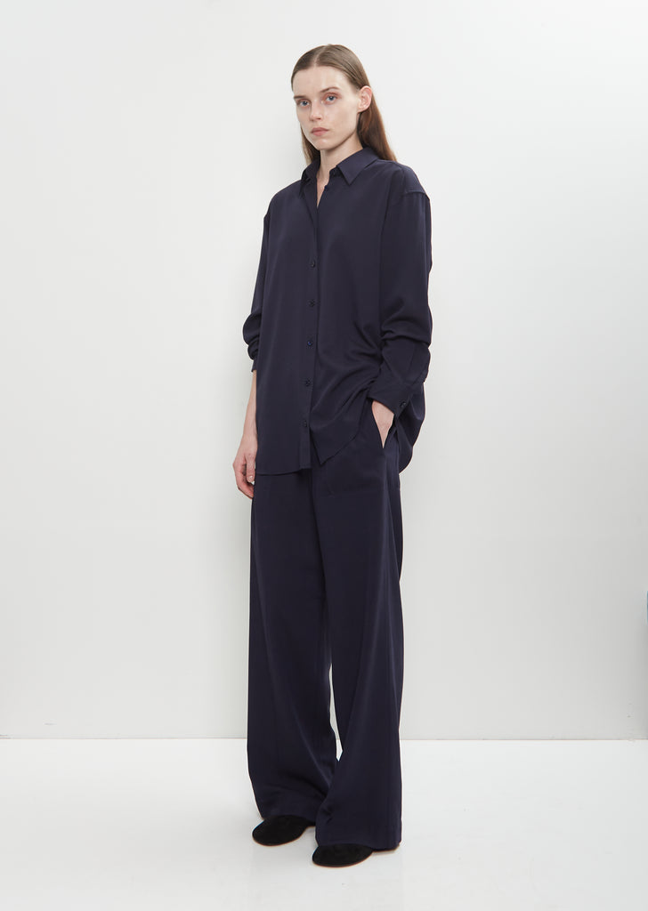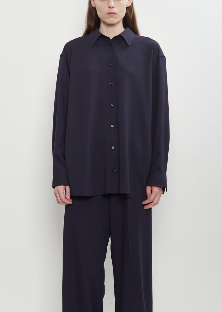 Toteme navy shirt with a pointed collar and tonal button front in fluid viscose wool blend. Features dropped shoulders, buttoned cuffs, and an inverted box pleat at back yoke.