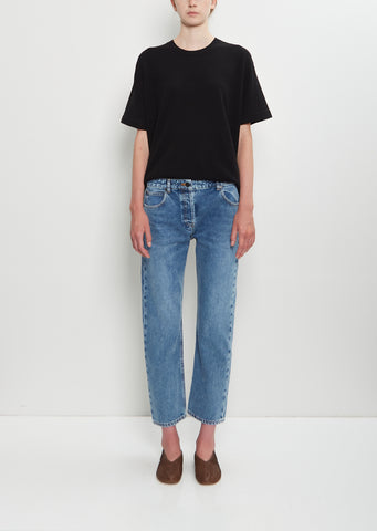 The Essentials Collection — The Row medium blue mid-rise skinny leg 5-pocket jean in stone washed cotton denim. Features contrast top stitching and button-fly closure.