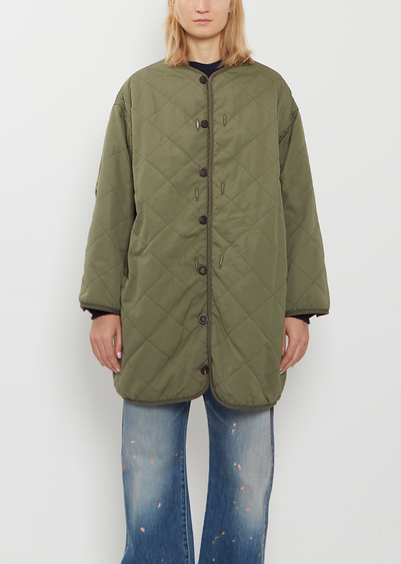 Visvim olive green reversible padded coat with custom water buffalo buttons closure in cotton and nylon blend twill with a washed, worn-in finish. Features a round neckline, dropped shoulders, and snap buttoned angled pockets. Trim finish throughout. Lined in off-white soft fleece. Relaxed fit.