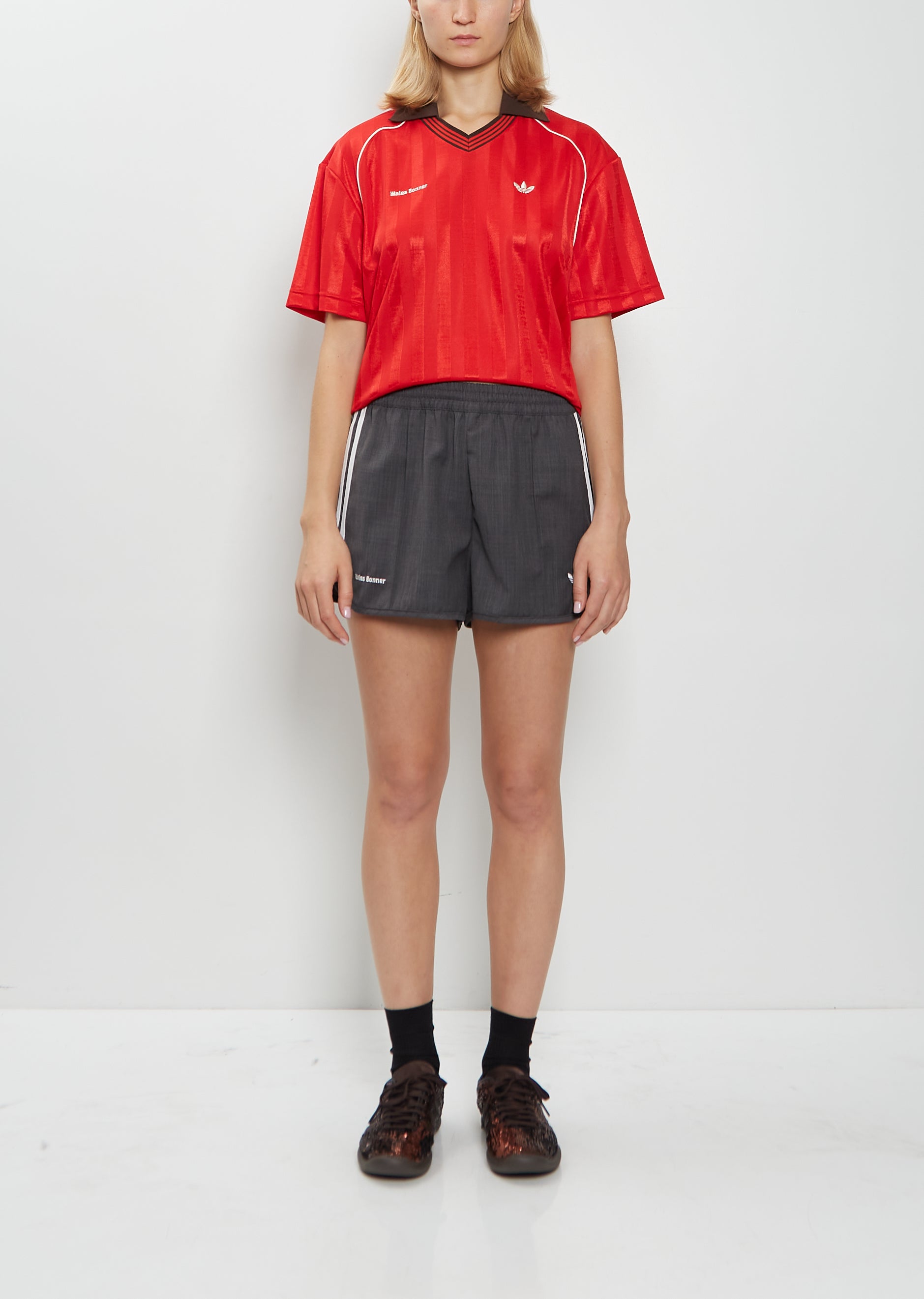 Wales Bonner in collaboration with adidas Originals dark heather grey pull-on short with an elasticated waist and front pintucks in a soft wool blend twill. Features an interior adjustable drawstring, embroidered logos at front, signature three stipe details at sides, and zippered side seam pockets.