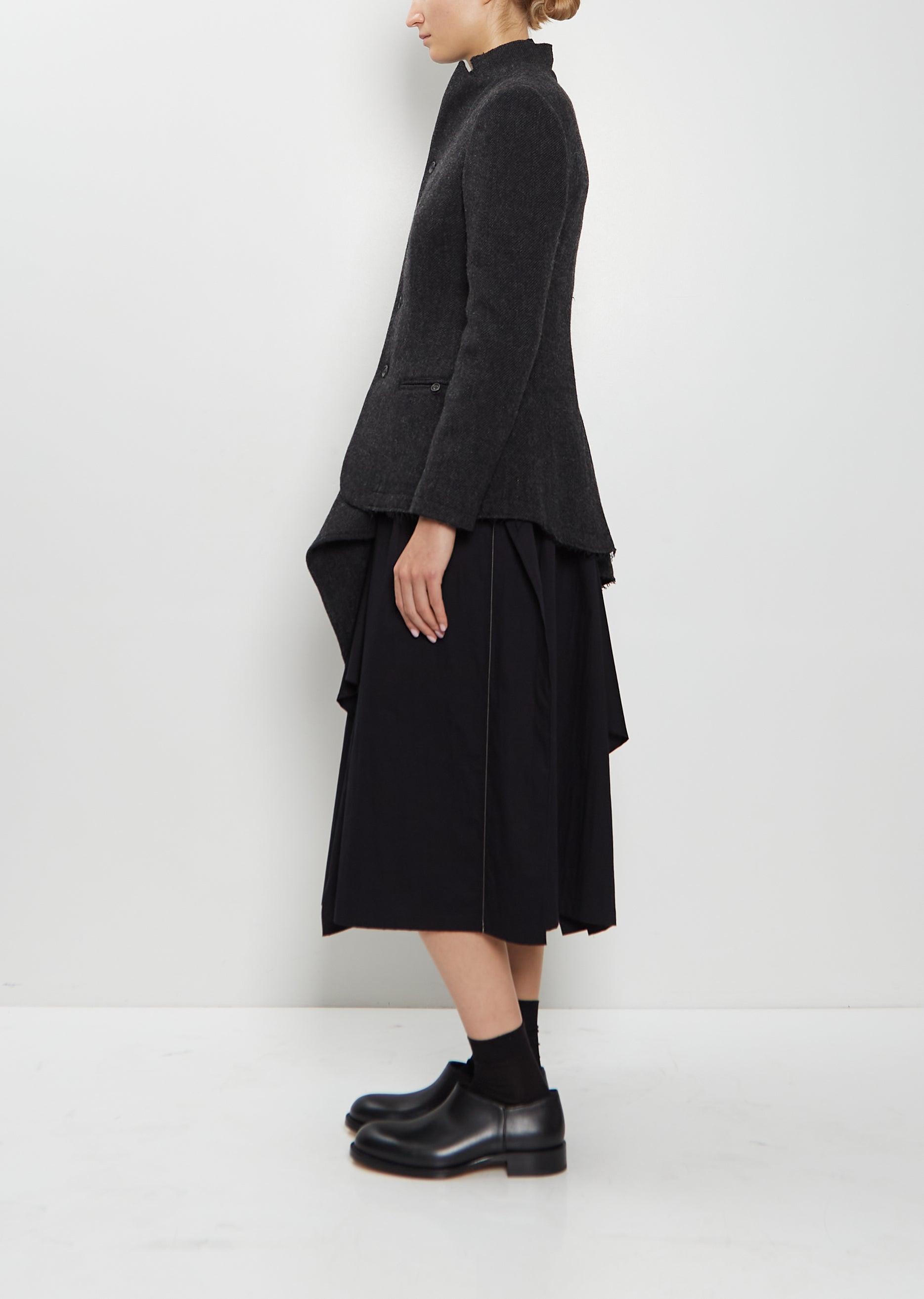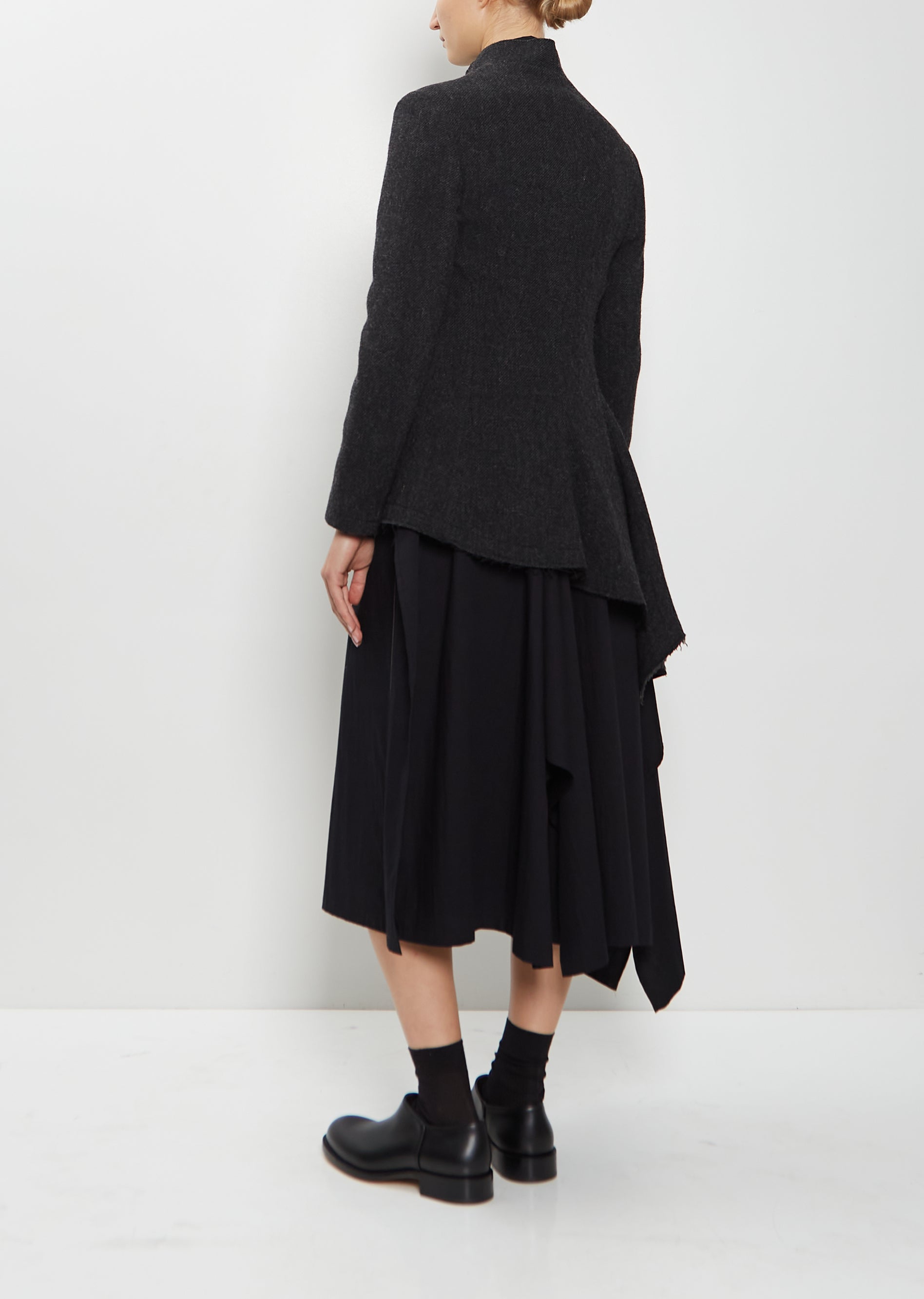 Yohji Yamamoto charcoal jacket with a notched stand collar and asymmetrical drape at side in a textured wool tweed cloth. Features set-in sleeves, a front buttoned welt pocket, stitched raw edge finishing at collar and hem, and a horn-hued button front. Sleeves lined in black cupro. Closer fit.