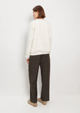La Garçonne Moderne relaxed fit wide leg trousers with self drawcord waist in Italian tropical wool. Cargo-style side pockets, and patch pockets with angled flaps at back. Straight legs with a full length.