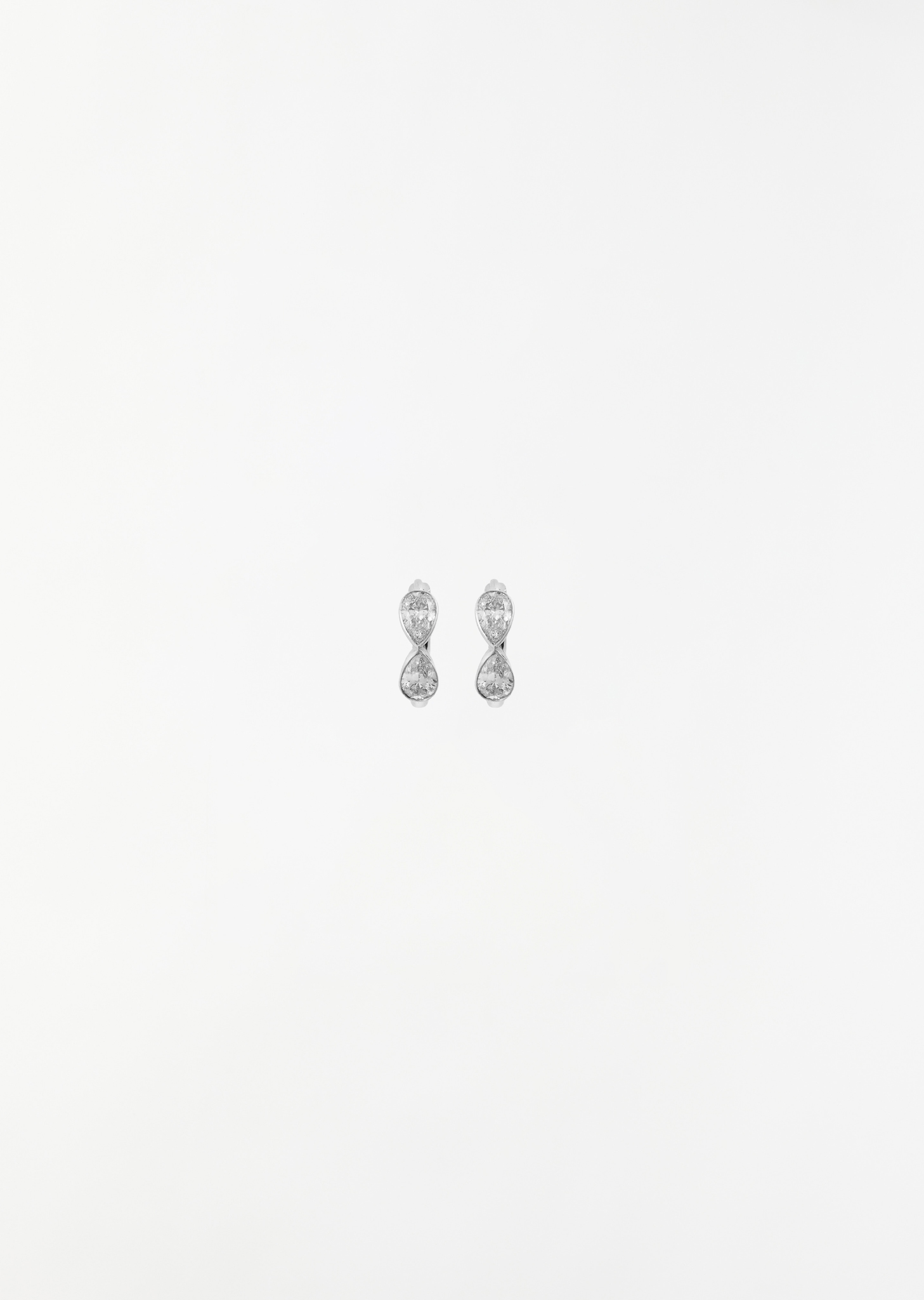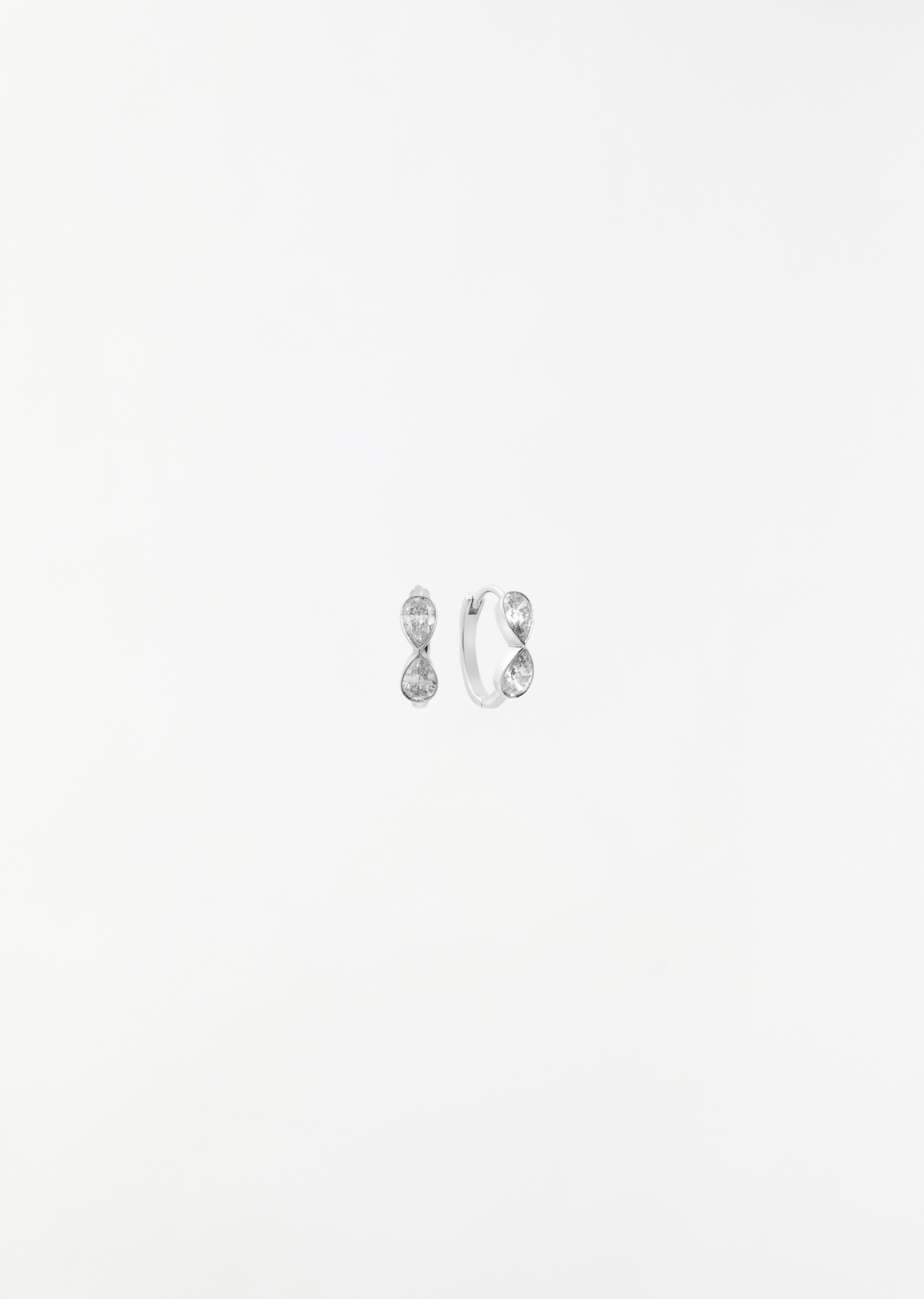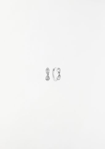 Ileana Makri mini huggie hoops with two pear-cut diamonds in a mirrored bezel setting and latch back in 18k white gold.