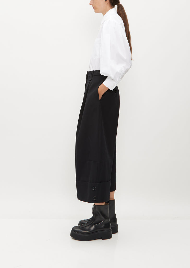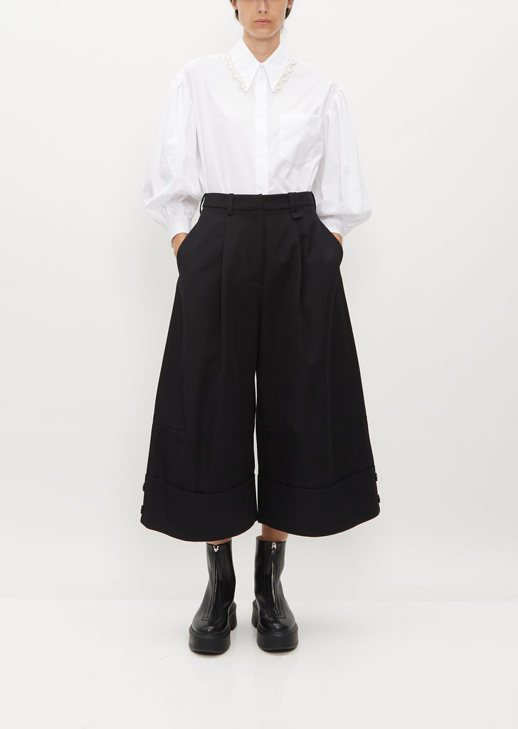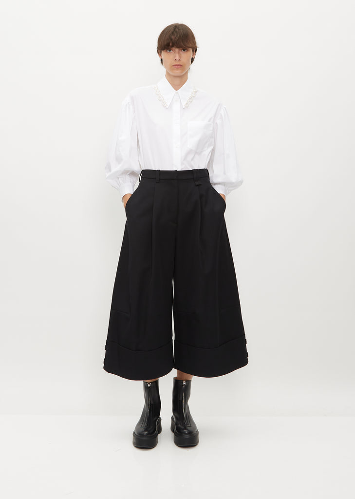 Simone Rocha black cropped, wide leg trousers with a high rise fit in wool twill. Features a wide cuff, single front pleat, belt loops, and angled side pockets. Finished with a concealed zip and tab fastener. These trousers come lined.