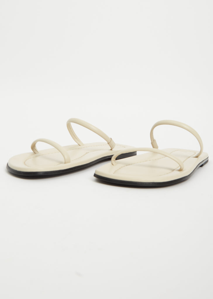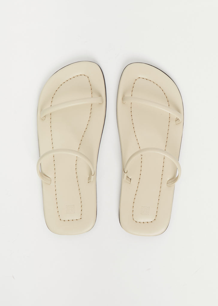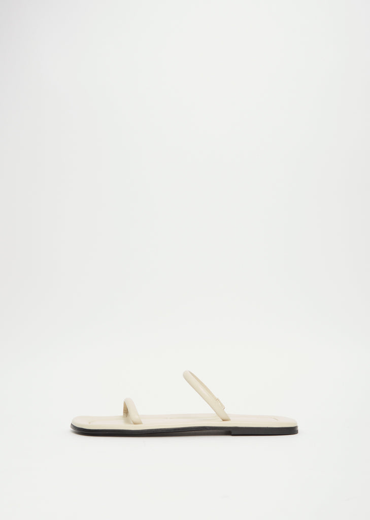 Totême slides constructed with two minimalist straps – one of which is elasticated crafted in Italy from smooth leather. Fully lined in tonal leather with a padded footbed and set on a low stacked sole with a rubber heel insert for comfort.