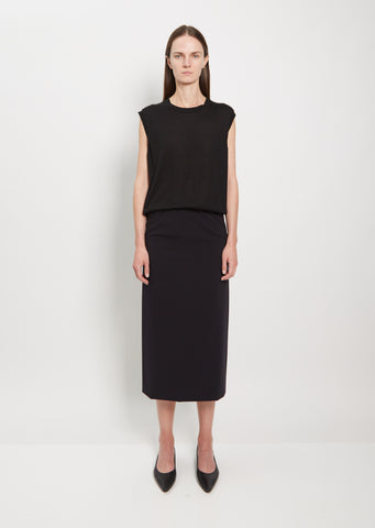 The Row black slim tube skirt in super soft stretch jersey with hidden elasticated waist, mid-length hemline and center back seam detail.