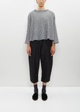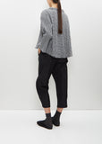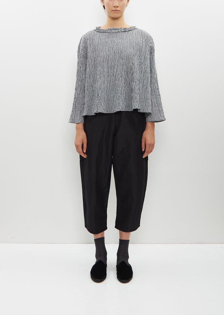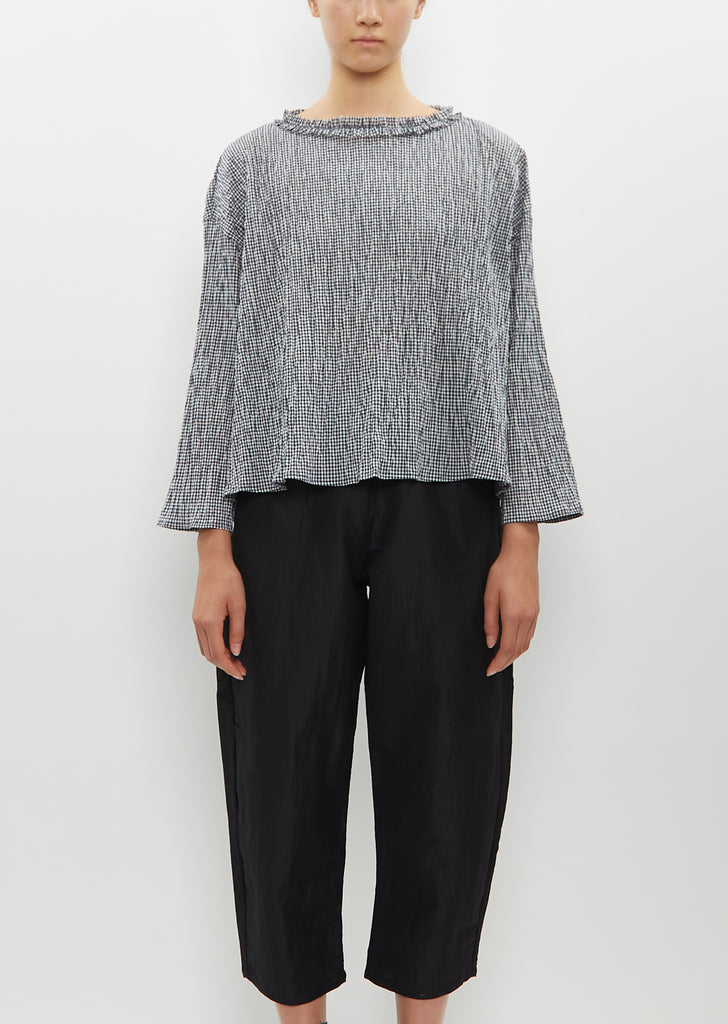 Apuntob navy and natural tone gingham print relaxed pullover top with a ruffled detail at neck in cotton blend fabric with a crinkle effect. Features a slightly curved hem.