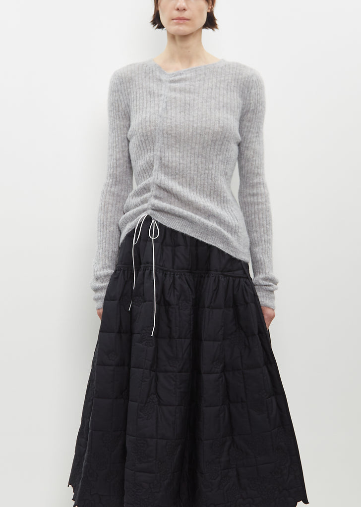 Cecilie Bahnsen soft grey crewneck sweater with adjustable drawcord for a ruched effect detail at front in lightweight mohair and wool blend knit. Features a high boatneck and slightly dropped shoulders.