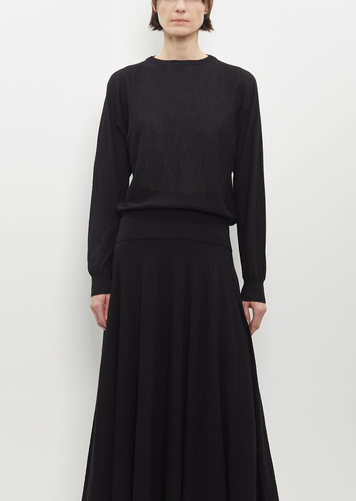 Extreme Cashmere raven black cropped sweater with a round neck and subtle bat sleeves in super-fine soft cashmere. Finished with rib trim at neck and cuffs.