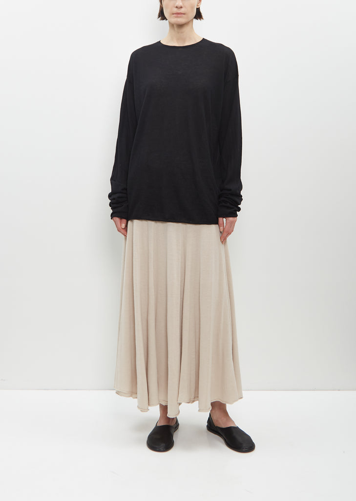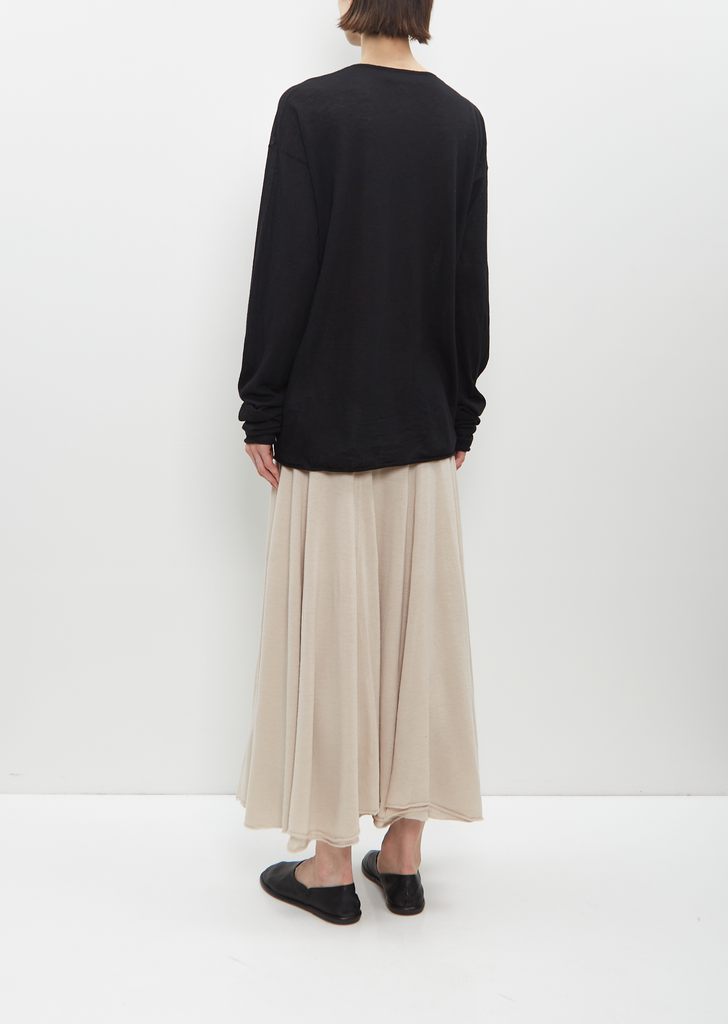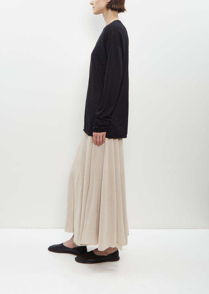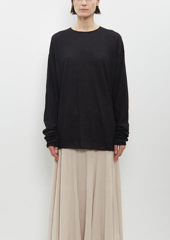 Extreme Cashmereraven black sweater with a round neck and drop shoulders in super-fine delicate sheer cashmere. Finished with rib trim at neck and rolled sleeve cuffs and hem.