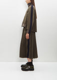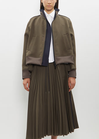 Sacai khaki paneled jacket with a high ribbed knit neck and a pleated panel at back in technical jersey. Features two angled pockets with press buttons, a contrasting knit strap at sleeves, a rib trim at cuffs and hem, and an exposed contrasting zipper closure.