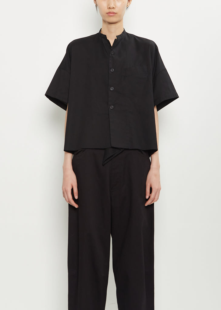 Y's black shirt with a band collar and drape detail at bottom of the placket in lightweight cotton. Features dropped shoulders, a chest welt pocket, a straight hem with split side seams, and a tonal button front. Boxy fit.