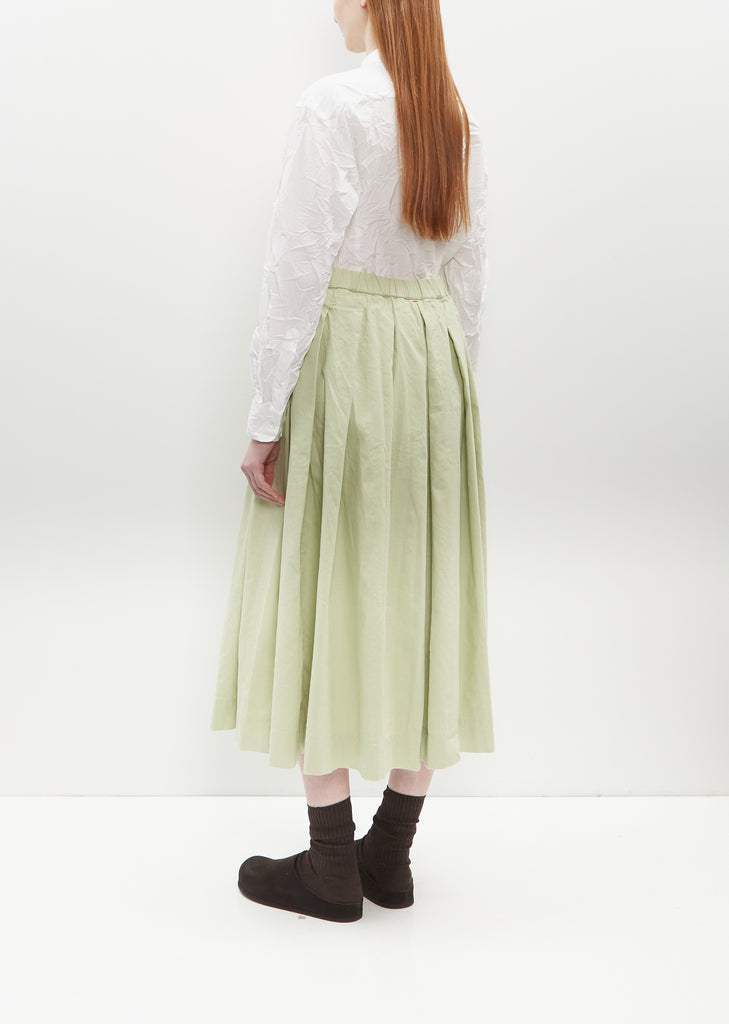 Casey Casey pleated skirt with buttoned tabs at waist in jade green washed mid-weight cotton. Features an elasticated back waist for pull on fit and side seam pockets. Finished with tonal buttons.