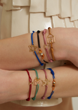 Aliita blue bracelet with swimmer pendant in hand-painted white, deep black, and pistachio green enamel. Features an adjustable cord.