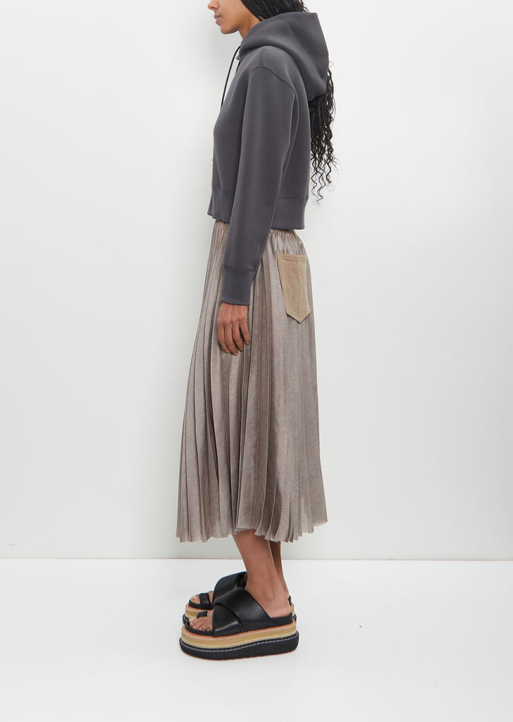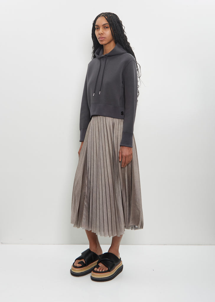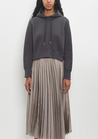 Sacai dark grey cropped hoodie with short buttoned slits at sides in cotton blend signature sponge jersey. Features an adjustable drawstring at hood with aglet end, dropped shoulders, straight hem and rib trim finishings at neck details, cuffs and hem. Relaxed fit.