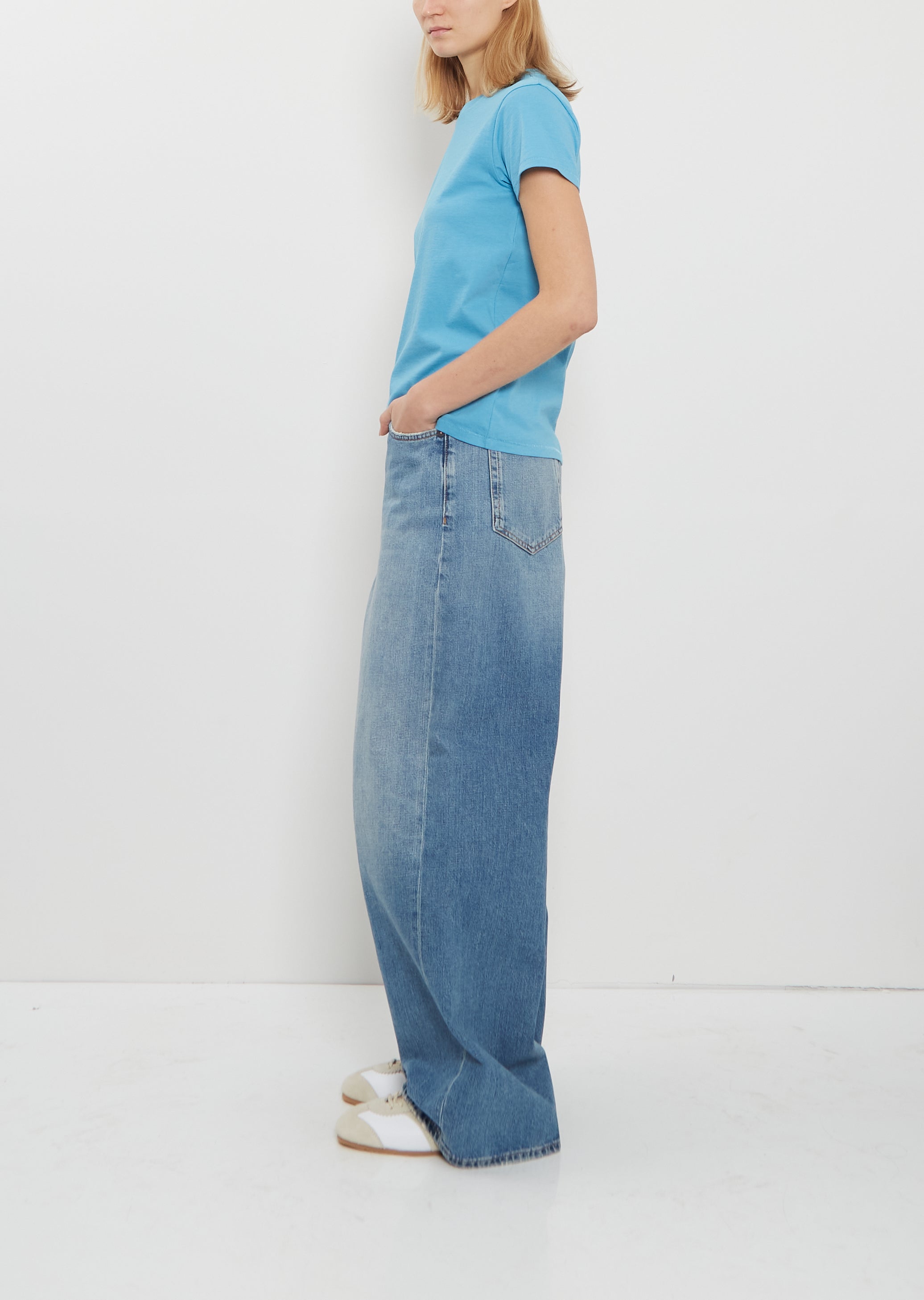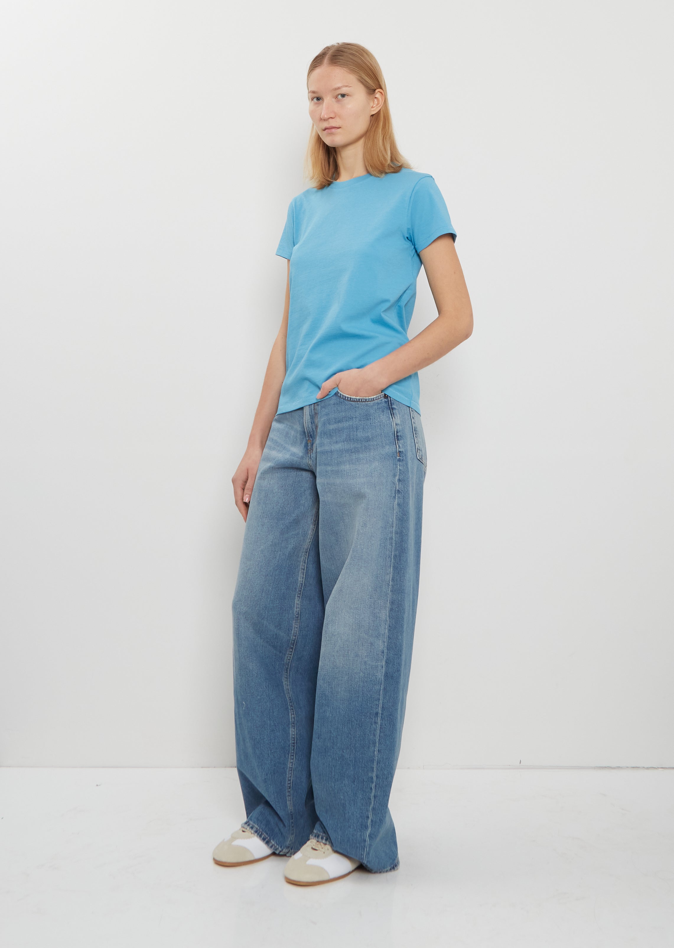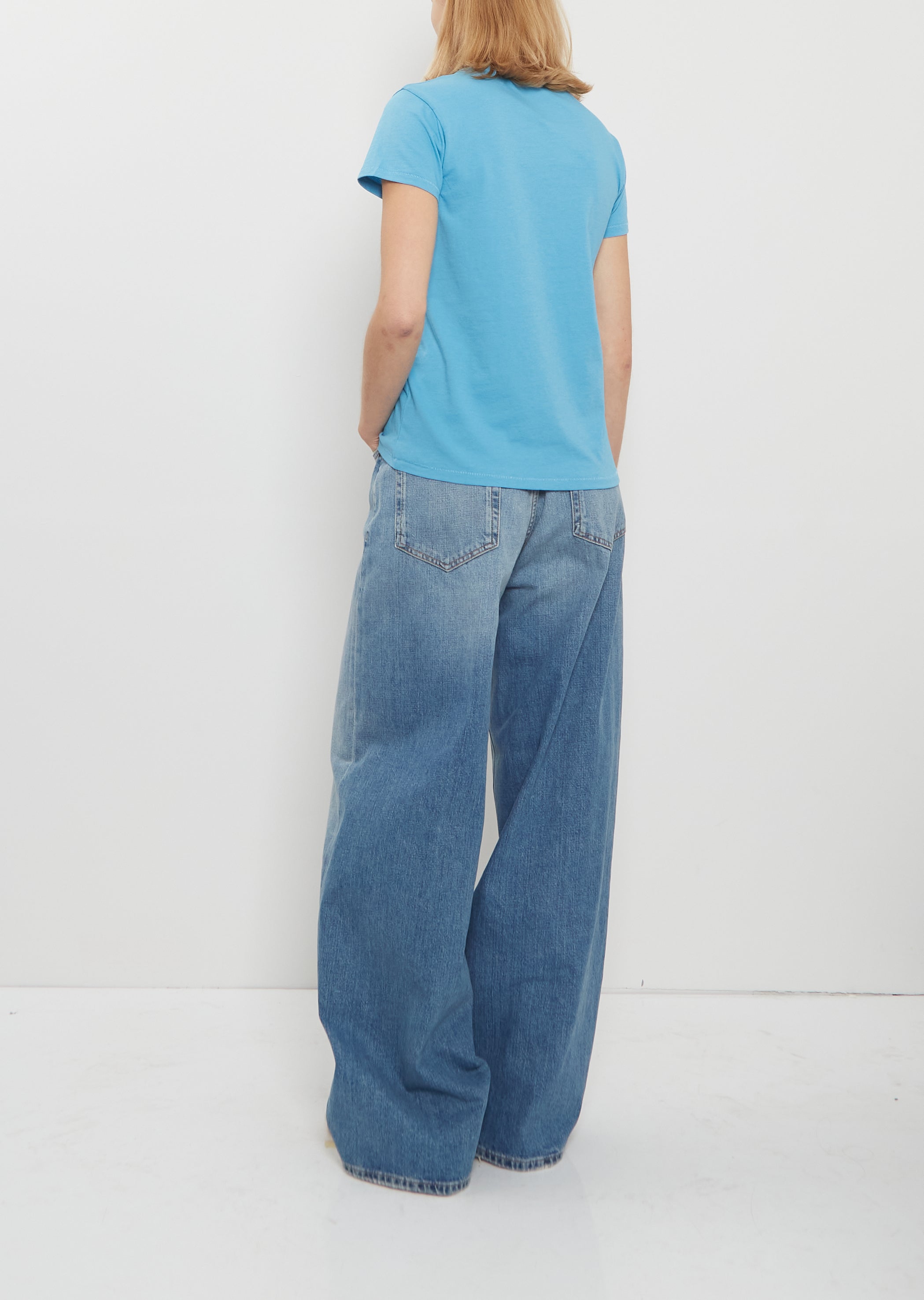 6397 bright blue beige signature short sleeve mini boy tee in a soft pima cotton. Features a rib trim finish at neckline. Straight cut with a relaxed fit.