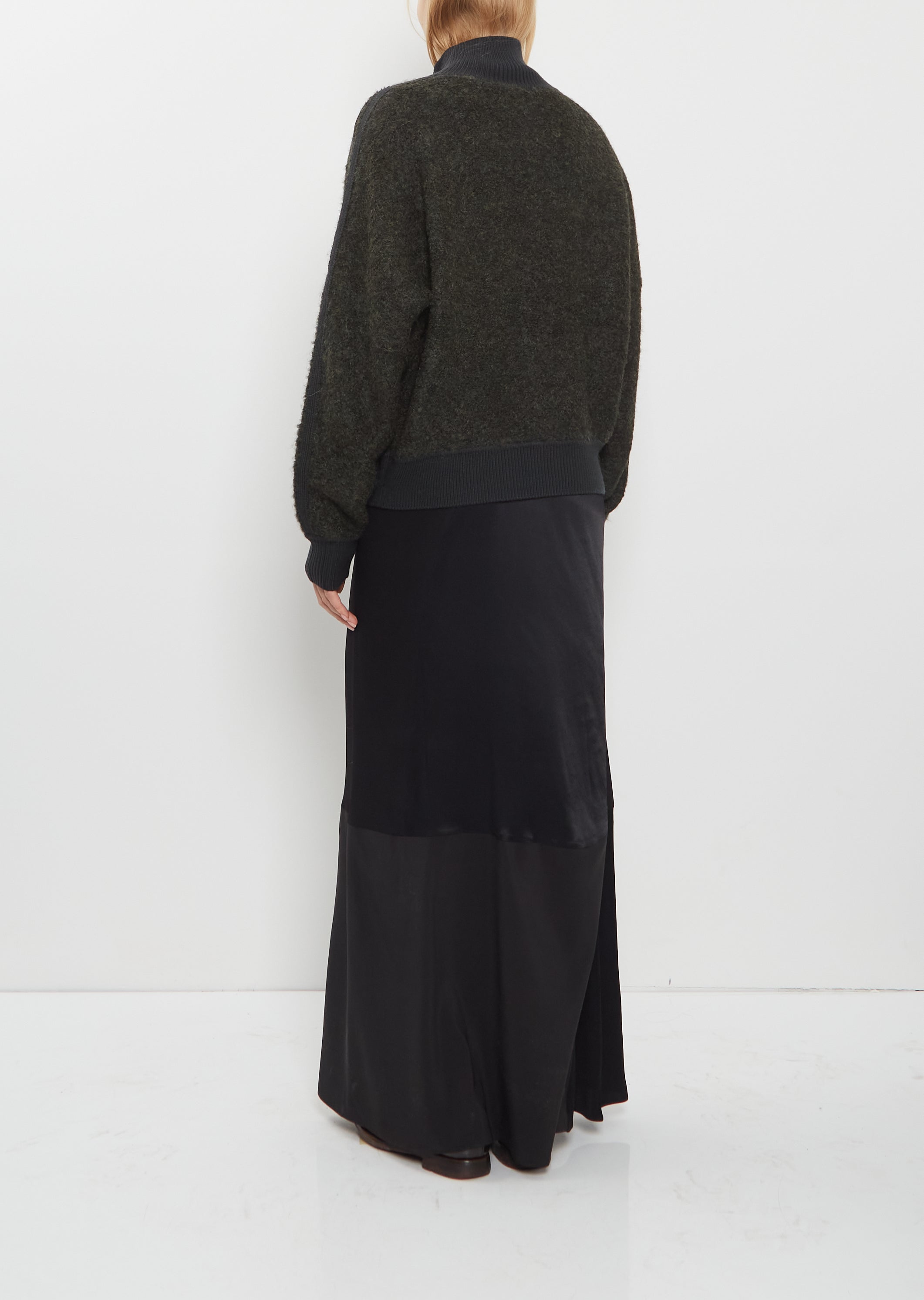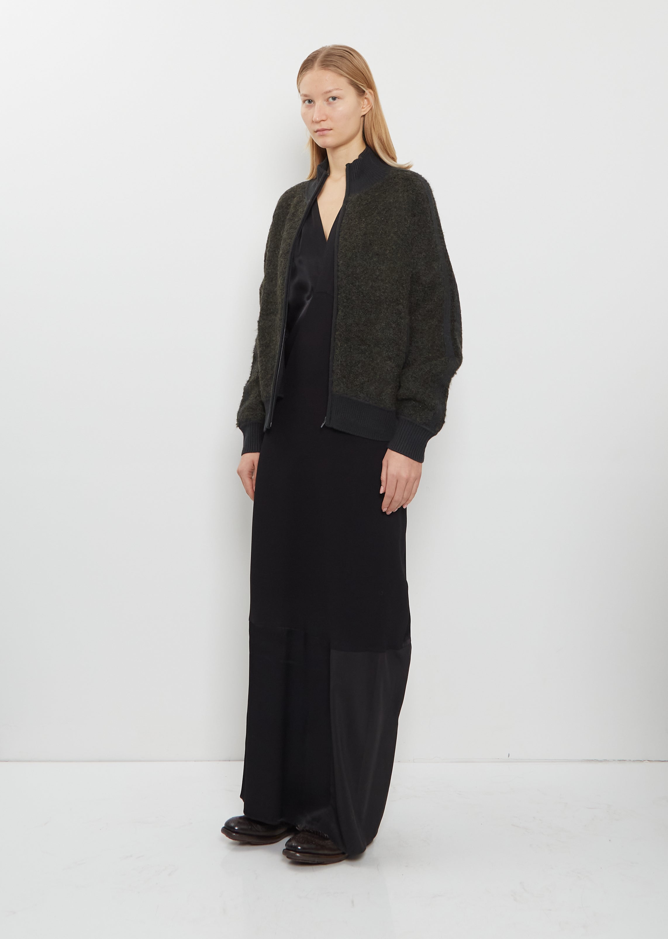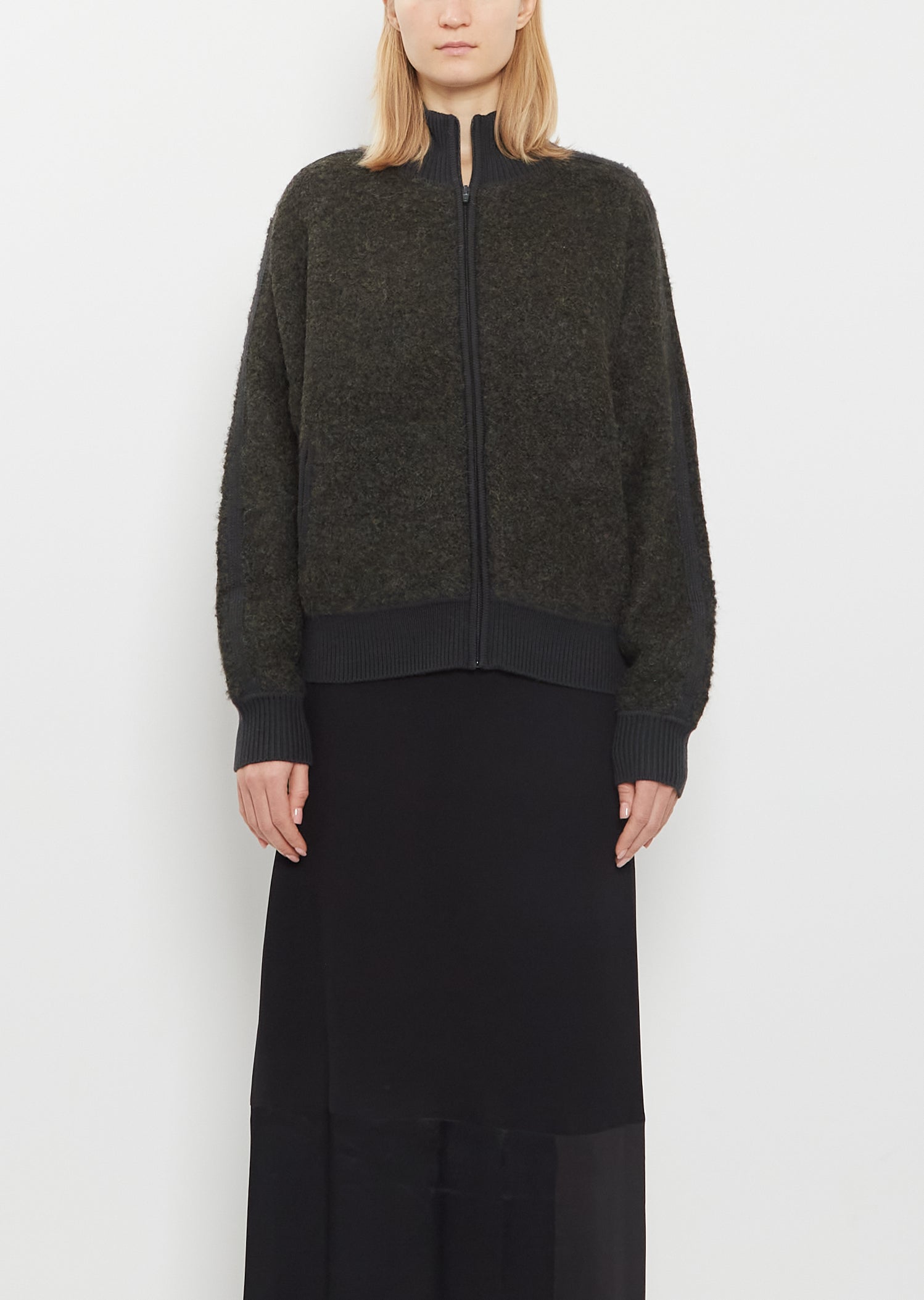 6397 dark green sweater jacket with a high neck and tonal zipper closure at front in alpaca blend knit. Features dropped shoulders, zippered side pockets, and contrasting merino wool ribbed trim along neck, cuffs and hem. Relaxed fit.
