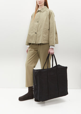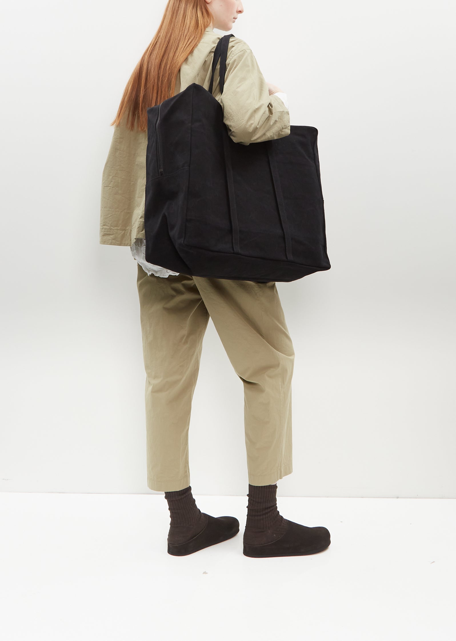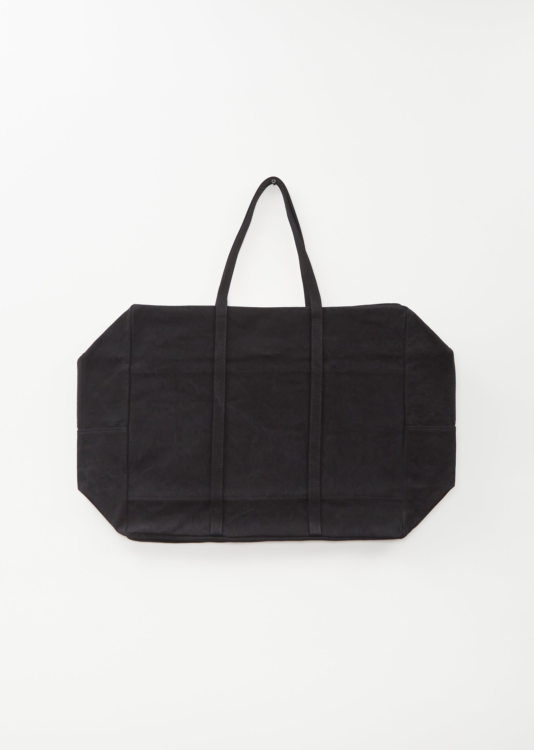 Amiacalva black large tote bag with a top tonal zipper closure and handles in pre-washed cotton canvas. Features six interior slip pockets and a gusseted base. Comes unlined.