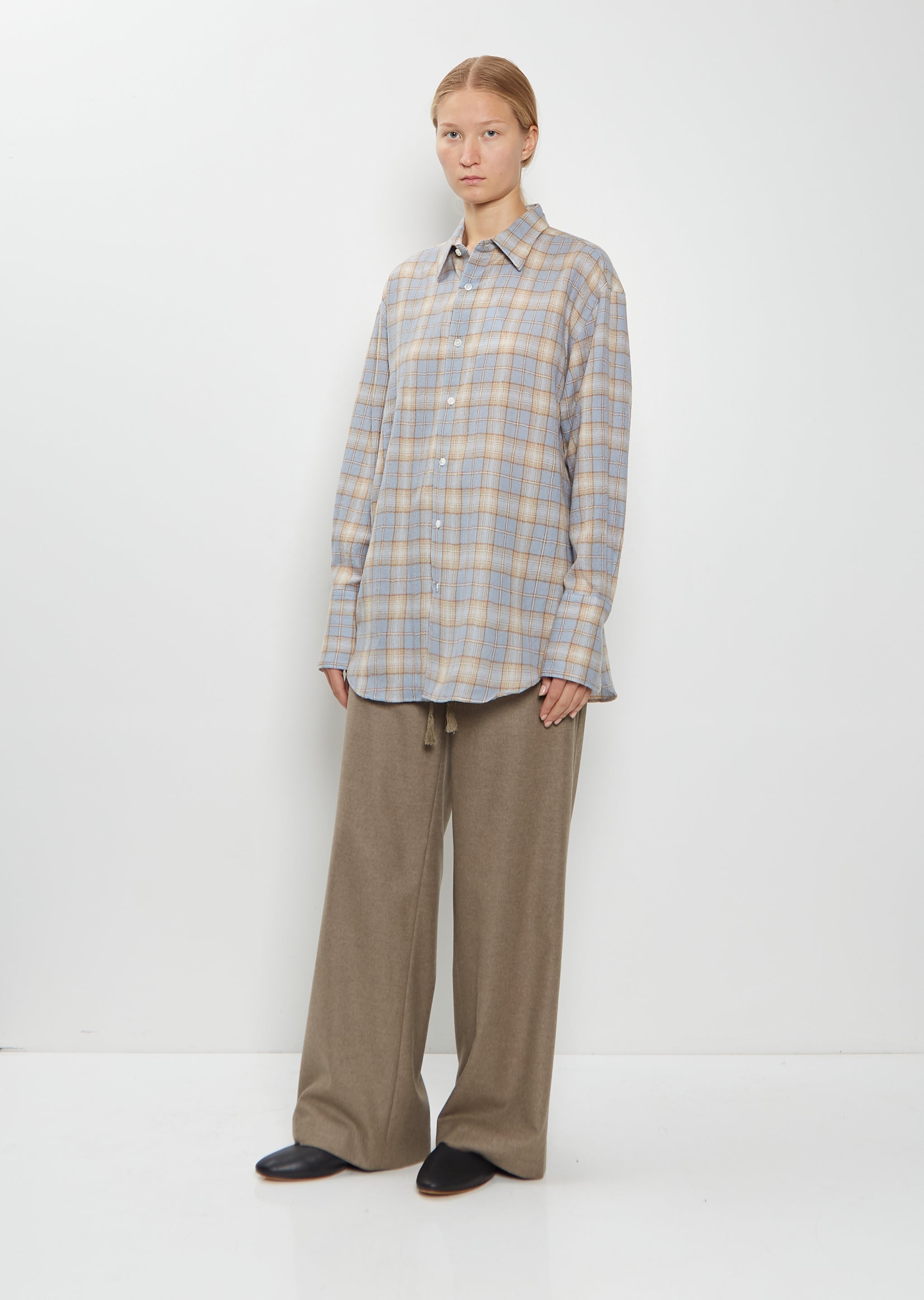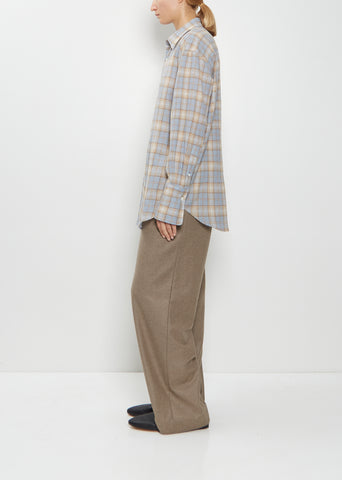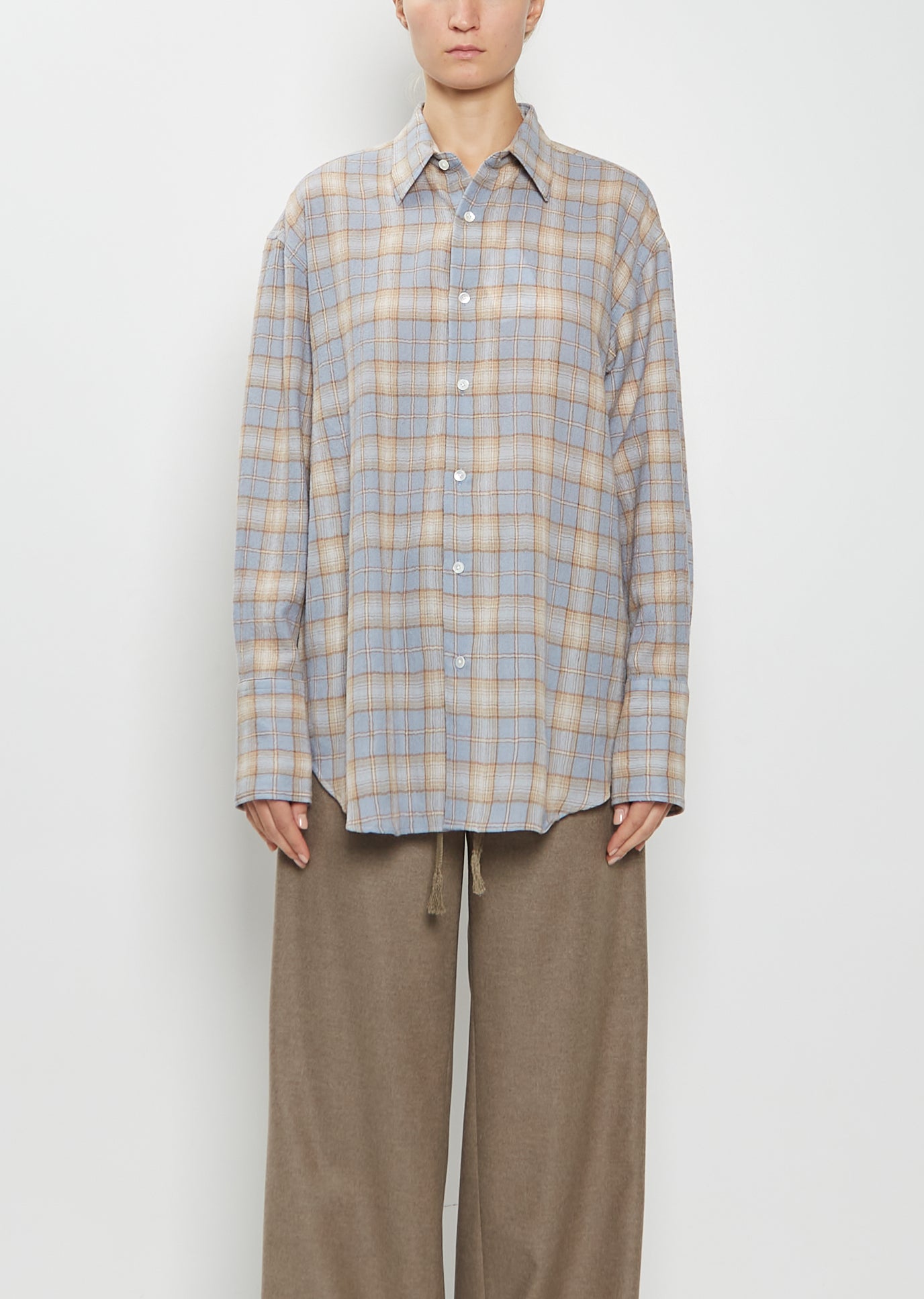Auralee light blue and beige plaid shirt with a classic collar and black button front in airy ultra-fine wool flannel with a refined check pattern. Features slightly dropped shoulders, buttoned cuffs, a curved hem, and back yoke. Relaxed fit.