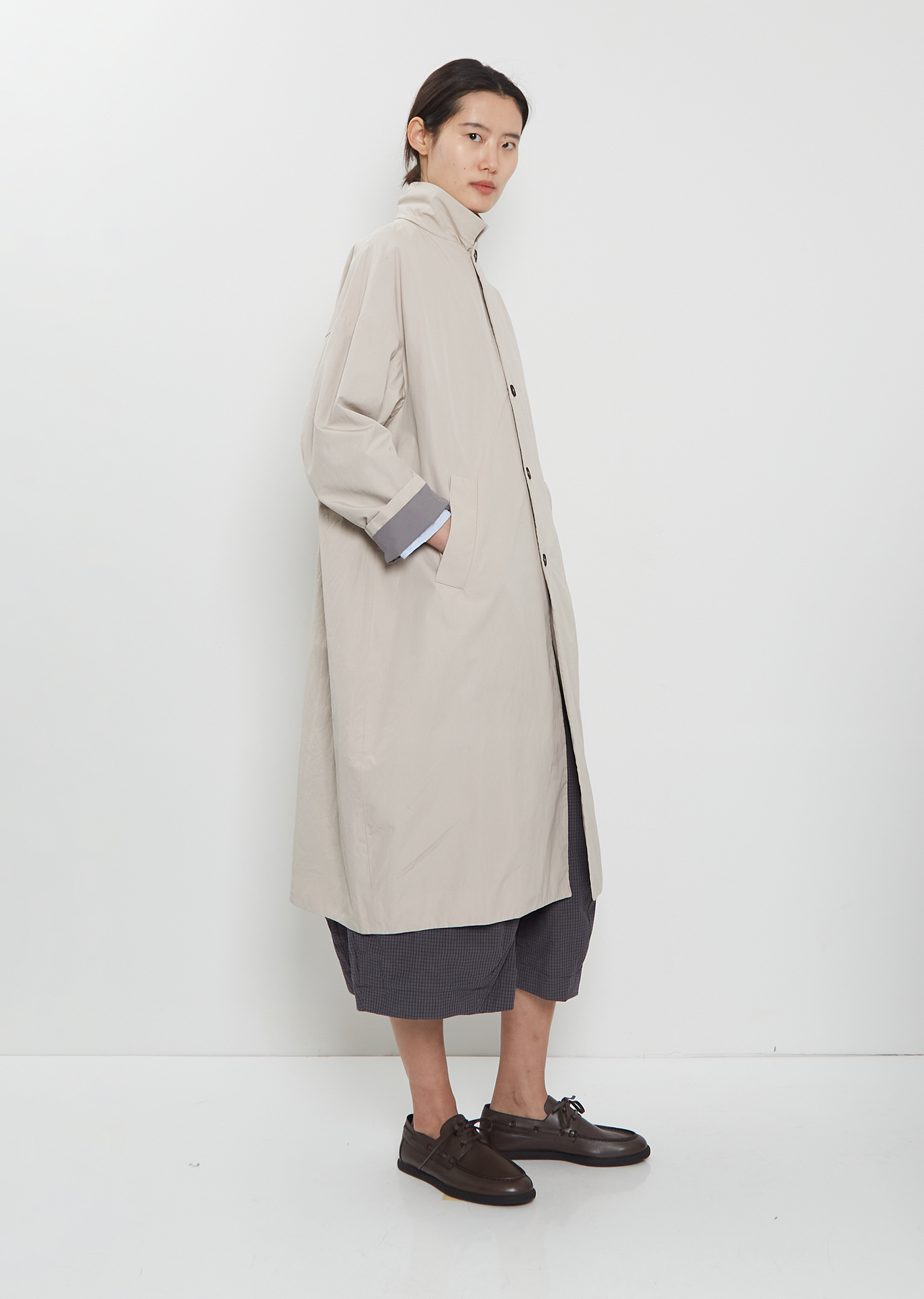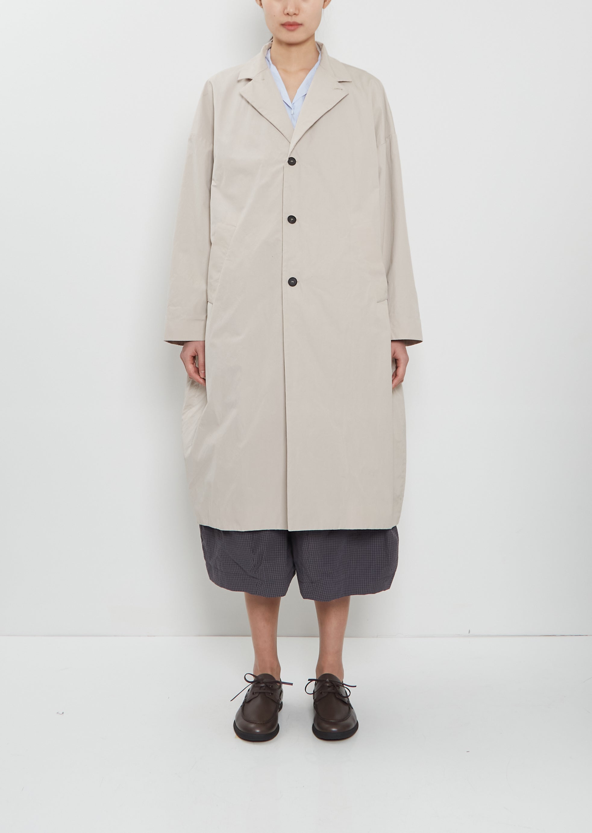 Bergfabel oversized balloon shaped coat with a notched collar and dropped shoulders in crisp cotton. Features angled welt pockets, two interior slip pockets and a contrasting buttons closure at front. Fully lined in grey cotton.