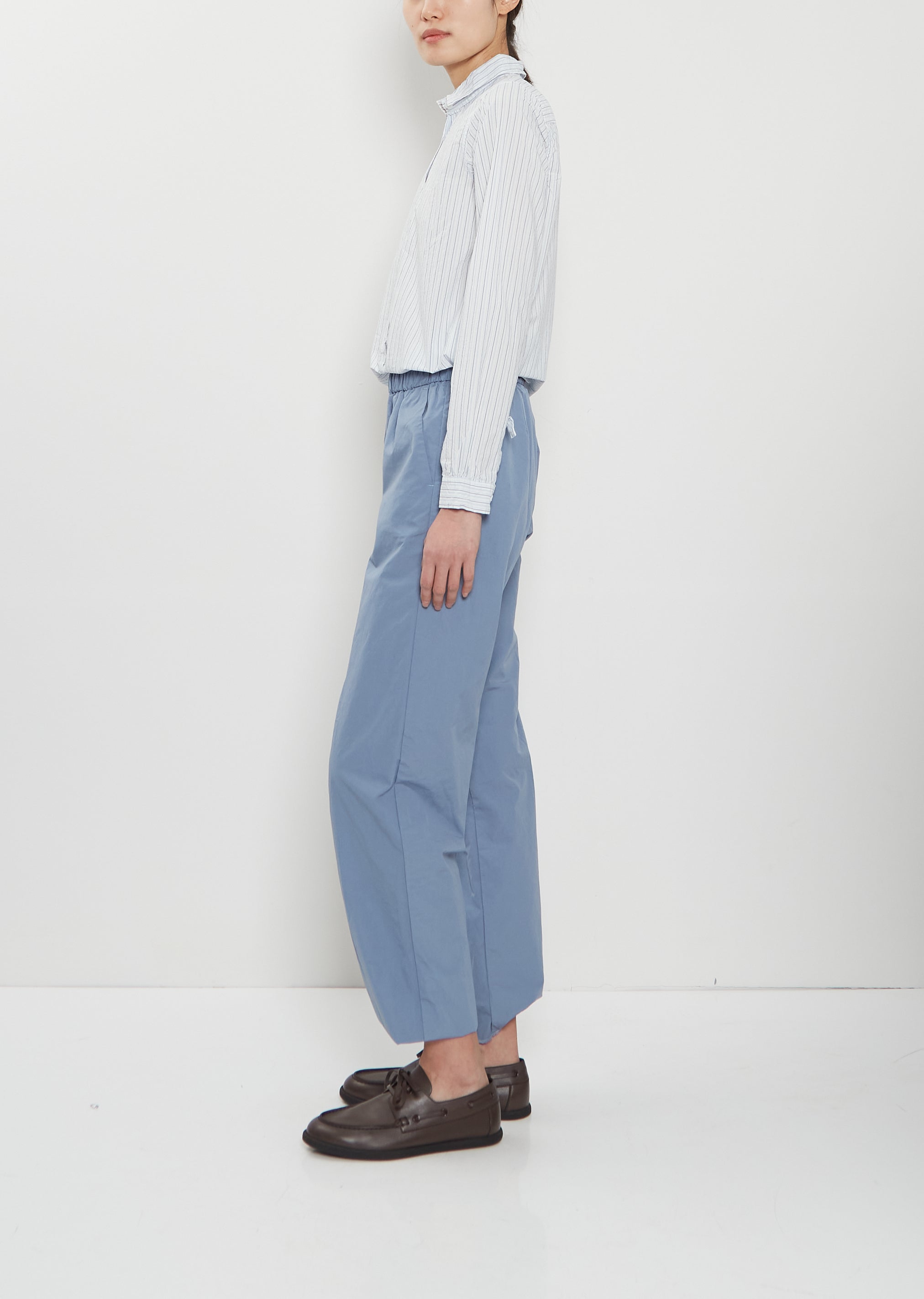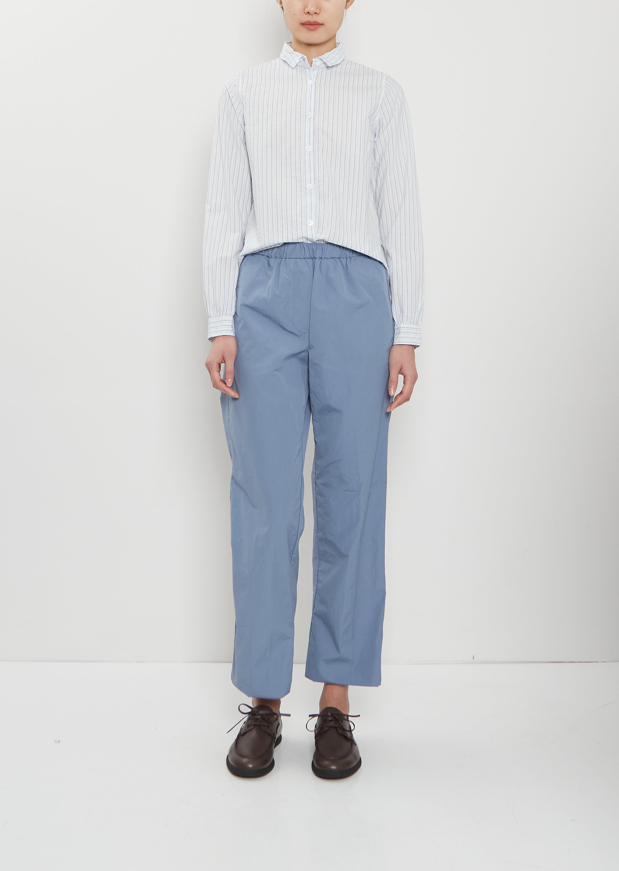 Bergfabel blue pull-on pants with straight legs and elasticated waistband in crisp cotton. Features side angled pockets and overlock finishing at hem. Relaxed fit.