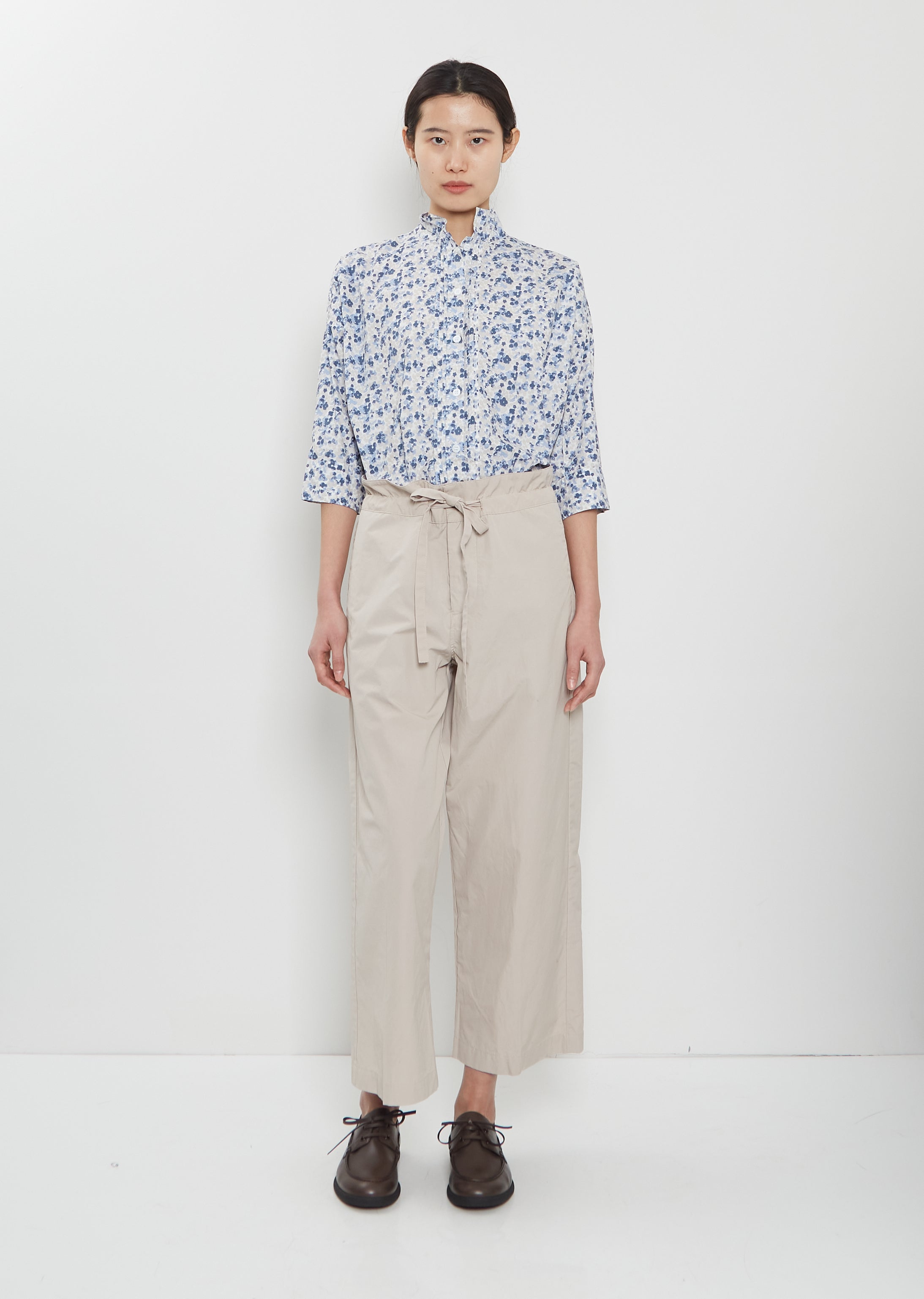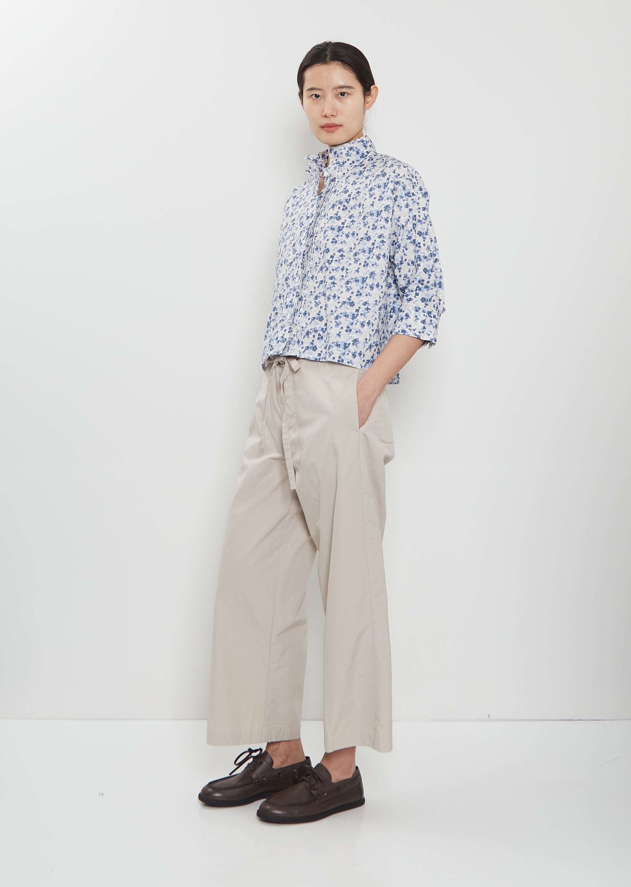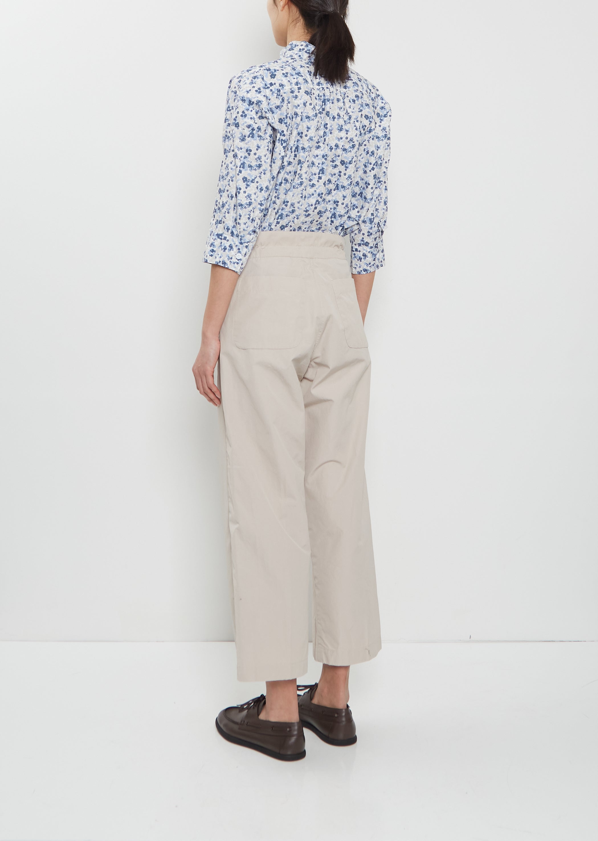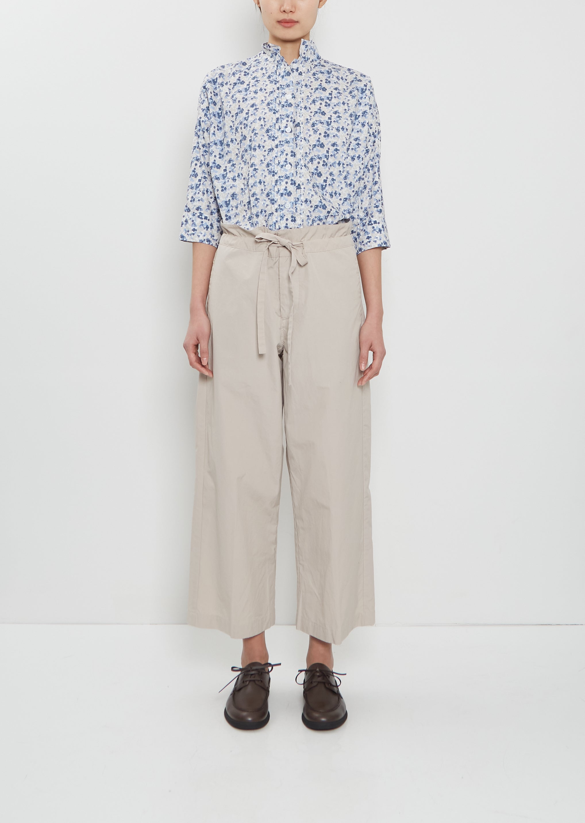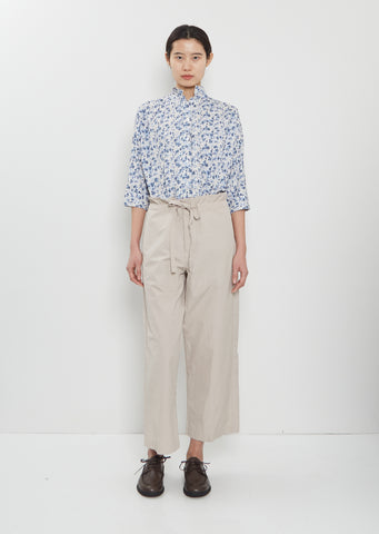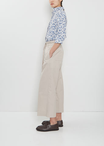 Bergfabel sand beige pull-on cropped pants with wide, straight legs in crisp and washed cotton. Features a tonal adjustable drawstring at waist, side seam pockets and patch pockets at back. Relaxed fit.
