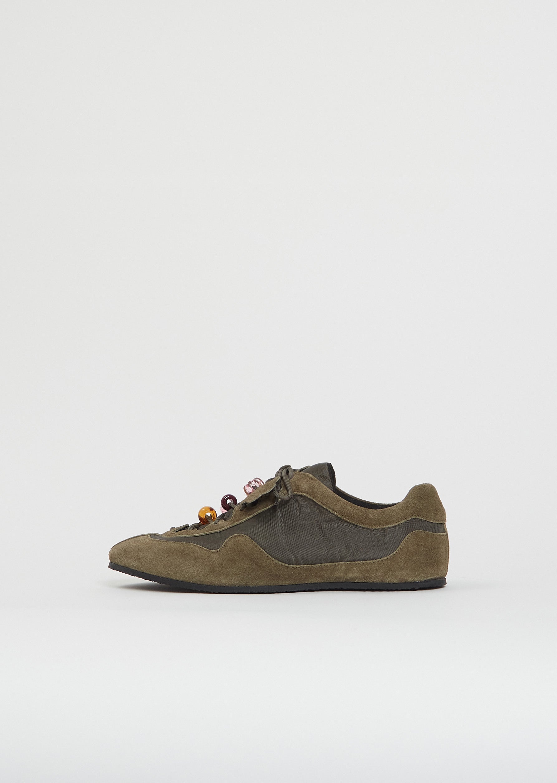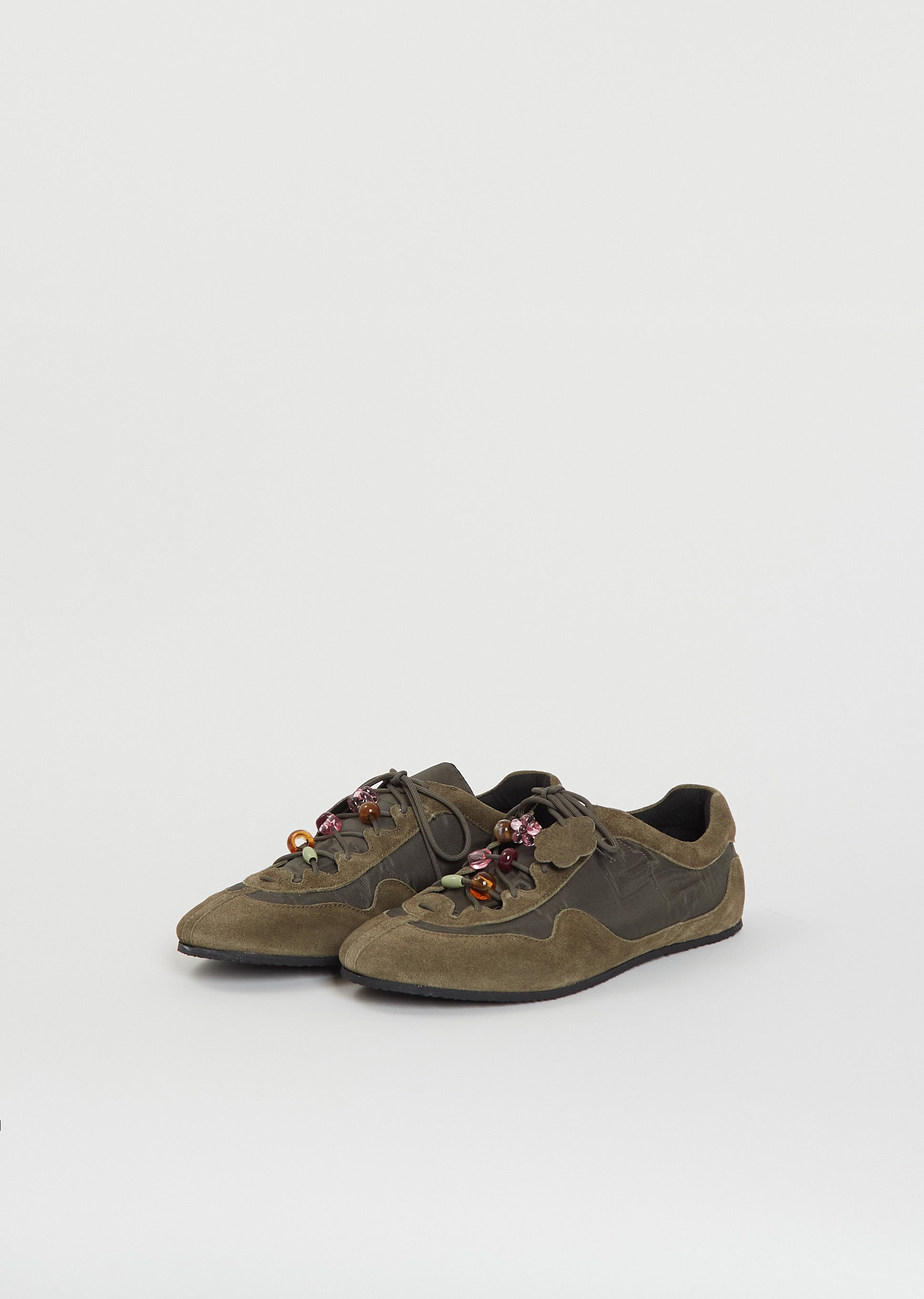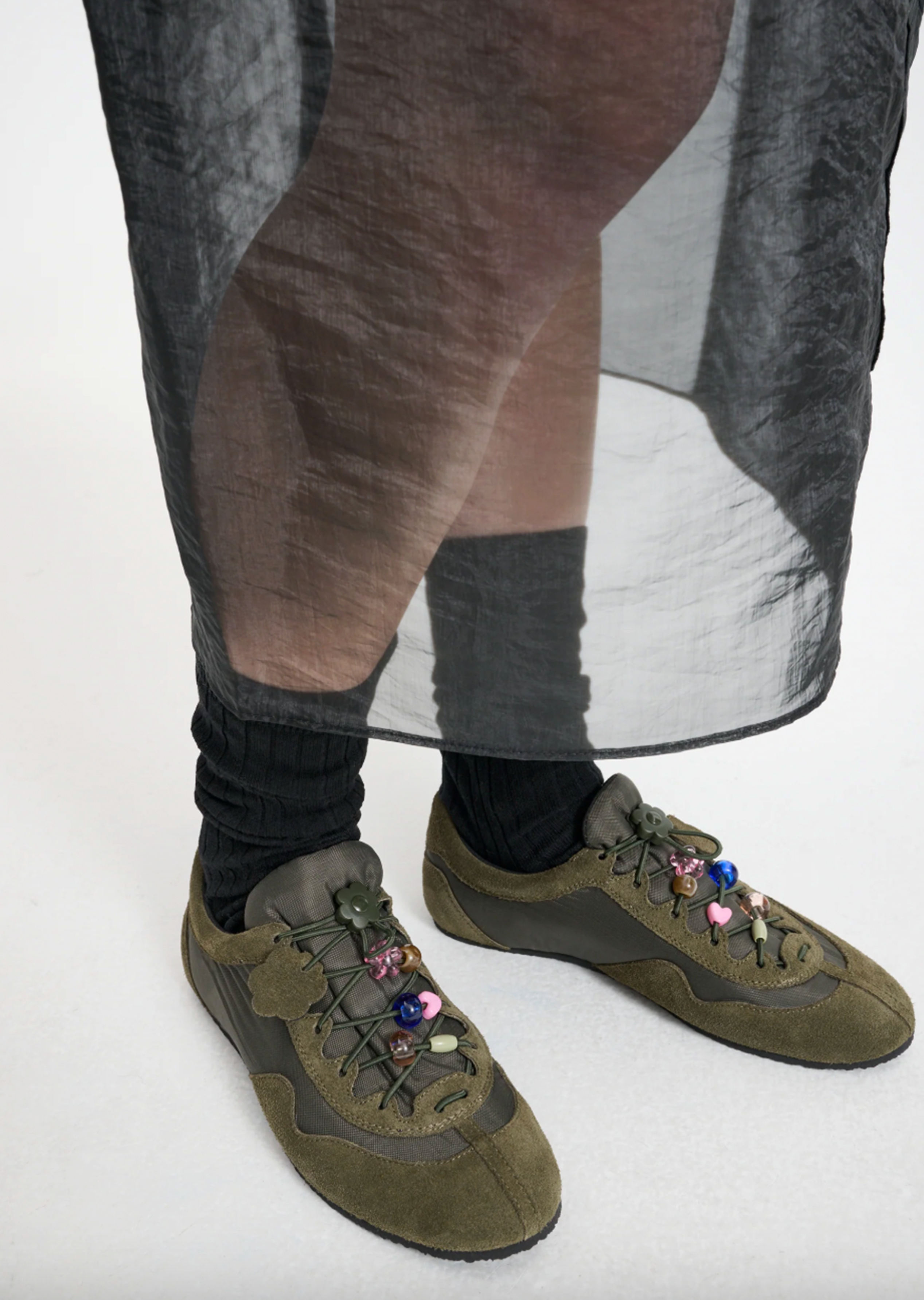 Cecilie Bahnsen olive green low-top sneaker with various beaded laces and a flower motif adjustable drawcord in soft suede leather and technical fabric. Features a round toe, flower motif leather detail at laces, and a rubber sole.