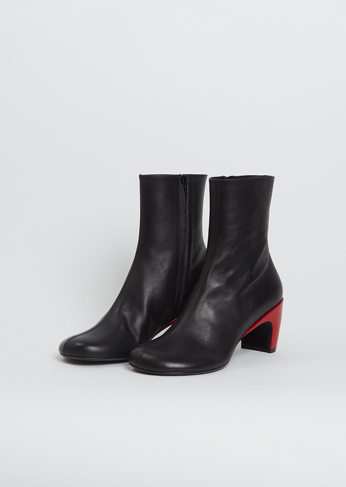 Dries Van Noten black boots with a contrasting red lacquered heel crafted in soft nappa leather. Features a sock-style silhouette, a round toe and tonal side zipper fastening.