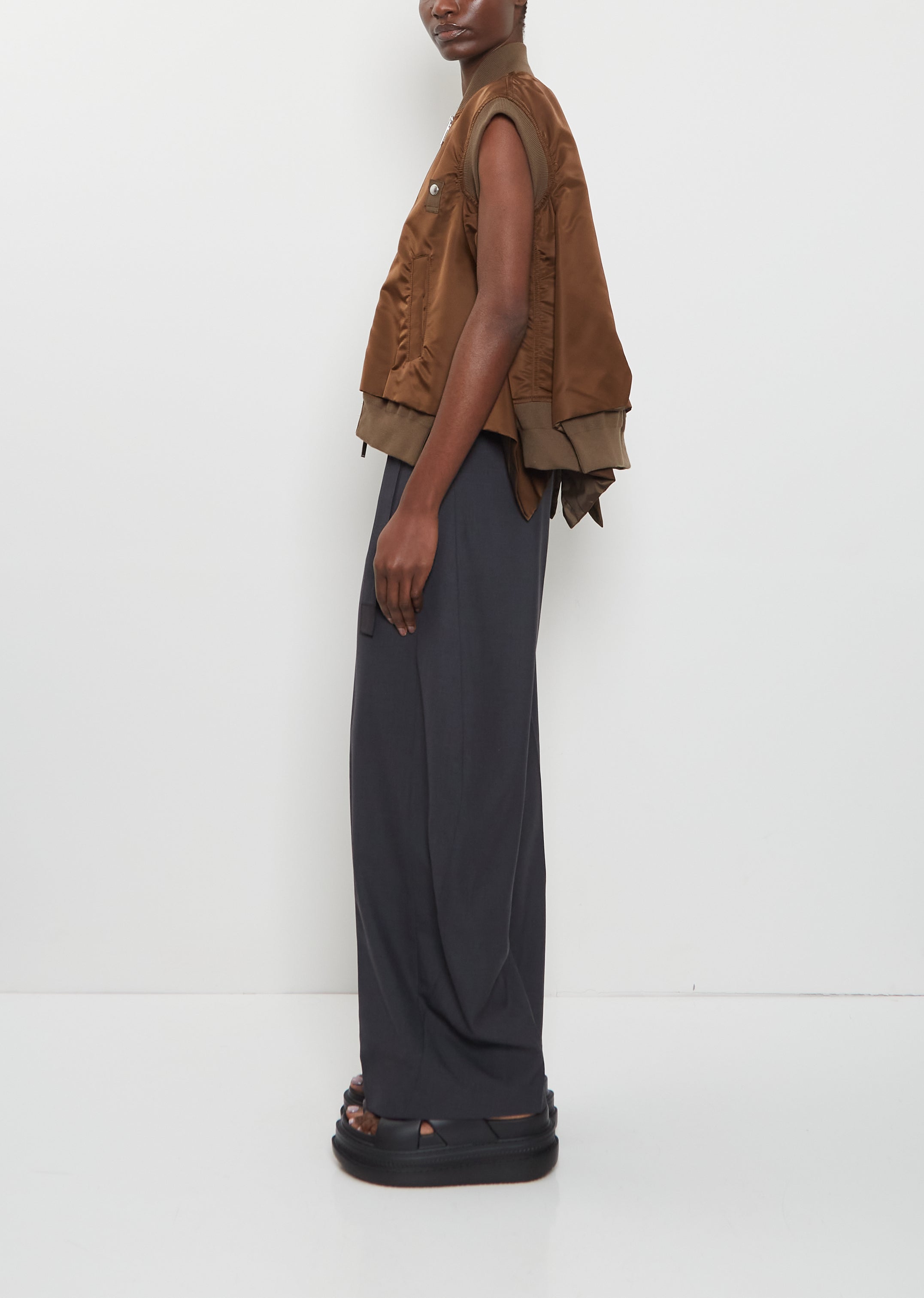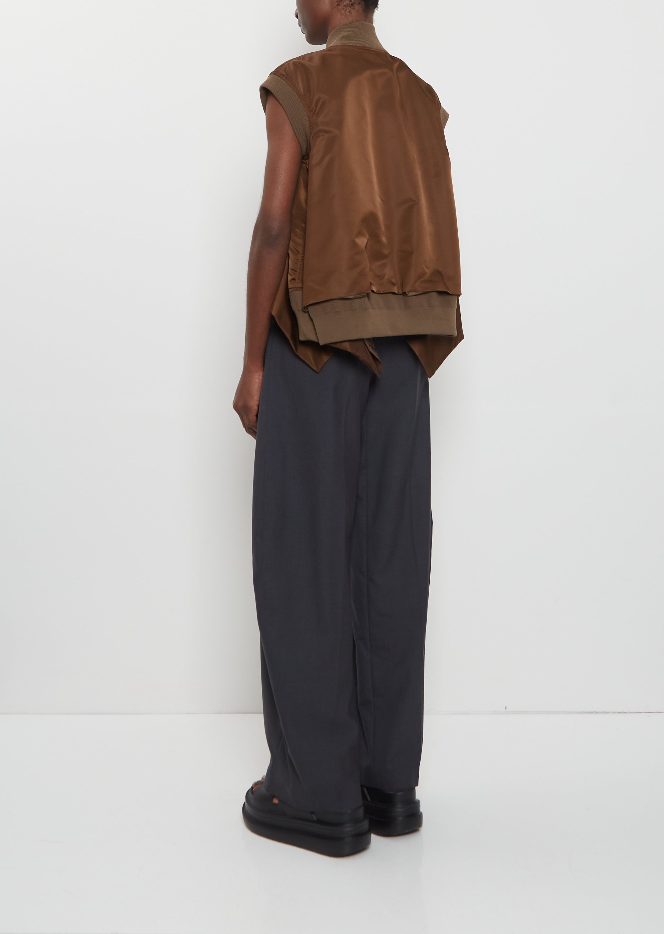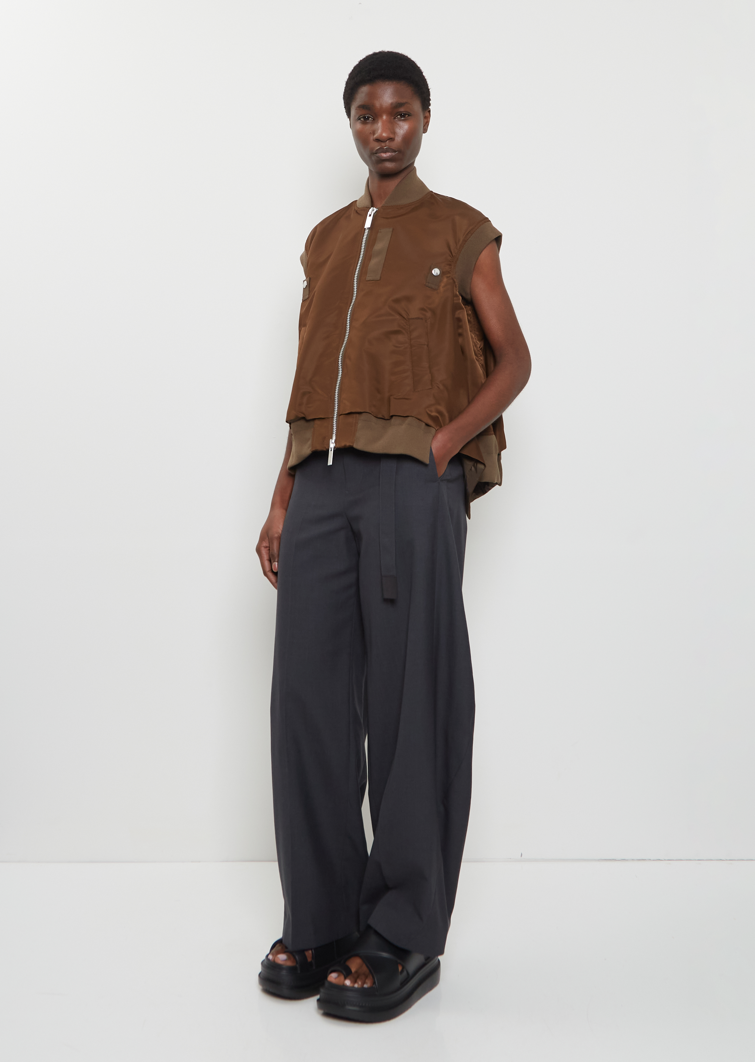 Sacai brown vest with a bomber style collar and gusseted sides in smooth nylon twill. Features decorative ripstop tabs with press buttons at chest, two angled welt pockets at waist, and a silver-toned two-way zipper closure at front. Finished with a ribbed knit trim at neck, arm openings and hem. Comes lined in khaki nylon fabric.