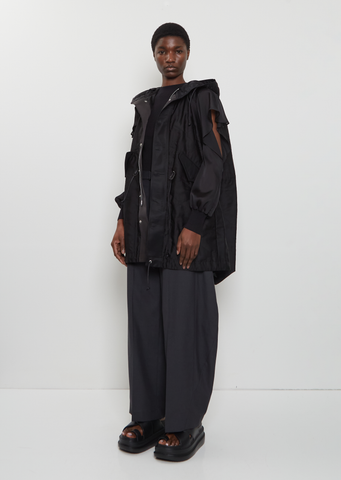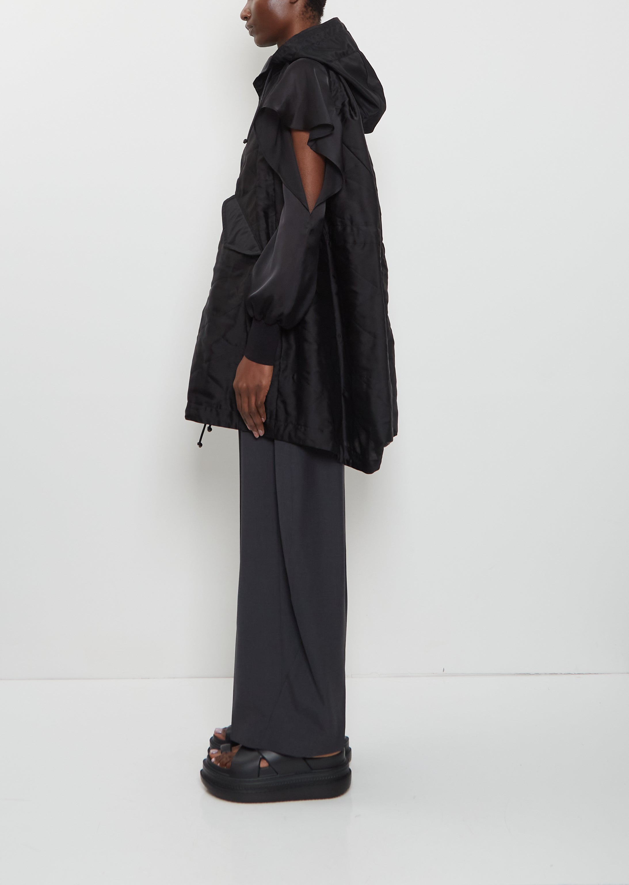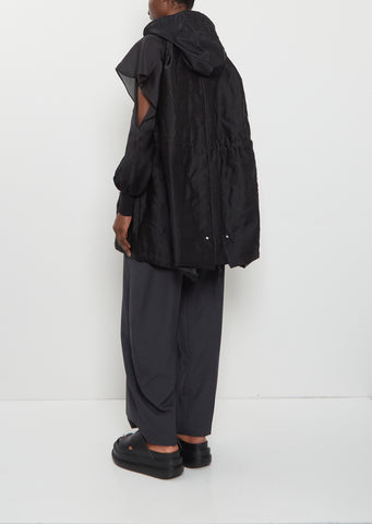 Sacai black hooded vest with elasticated drawstring at hood, waist and hem in layered lightweight quilted satin. Features flap press buttoned pockets, gusset at back, press buttons at back hem, and a concealed press buttons and silver-toned two-way zipper at front.