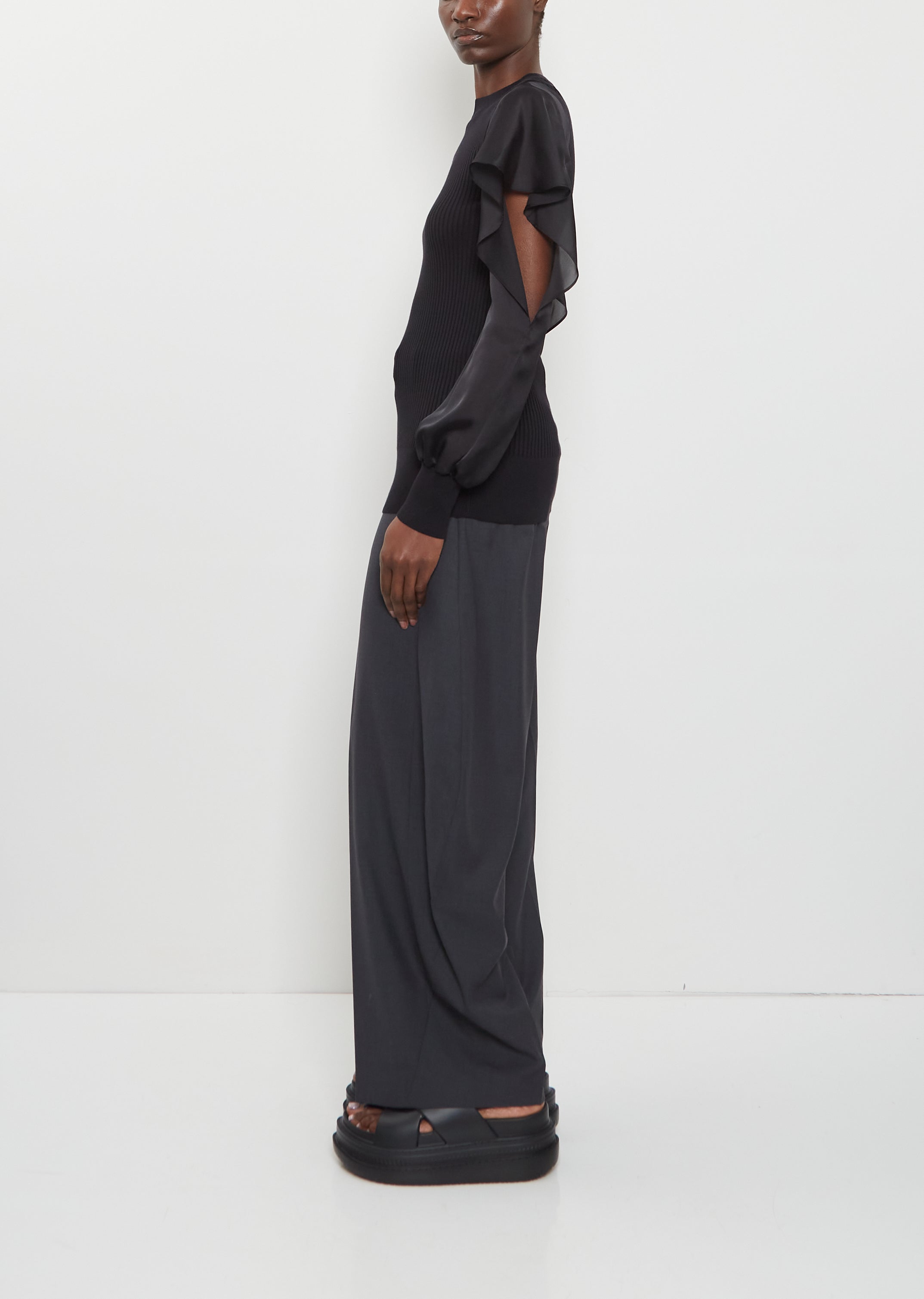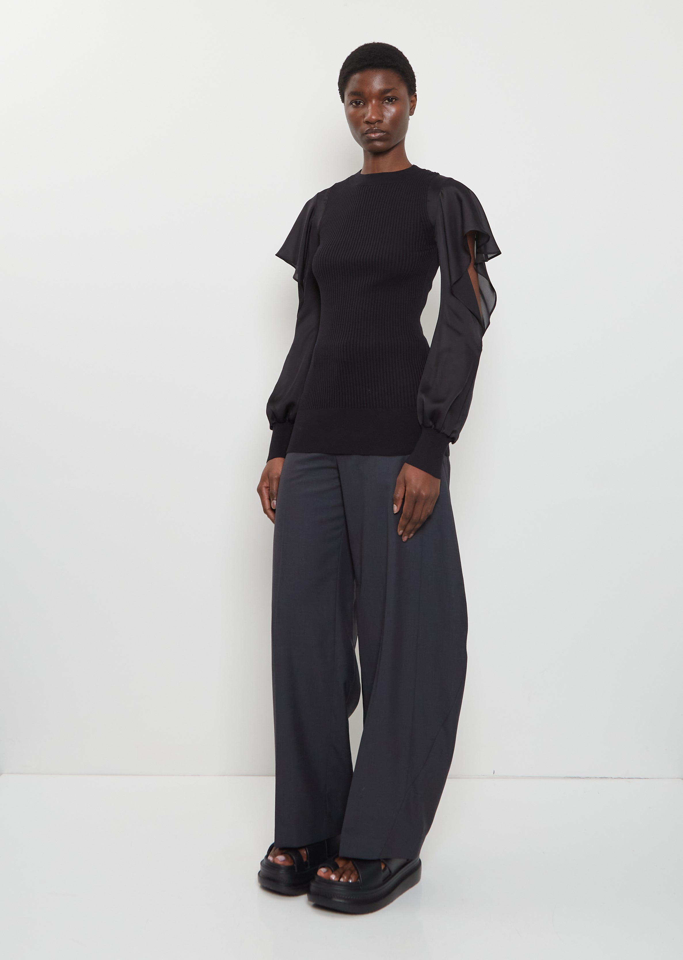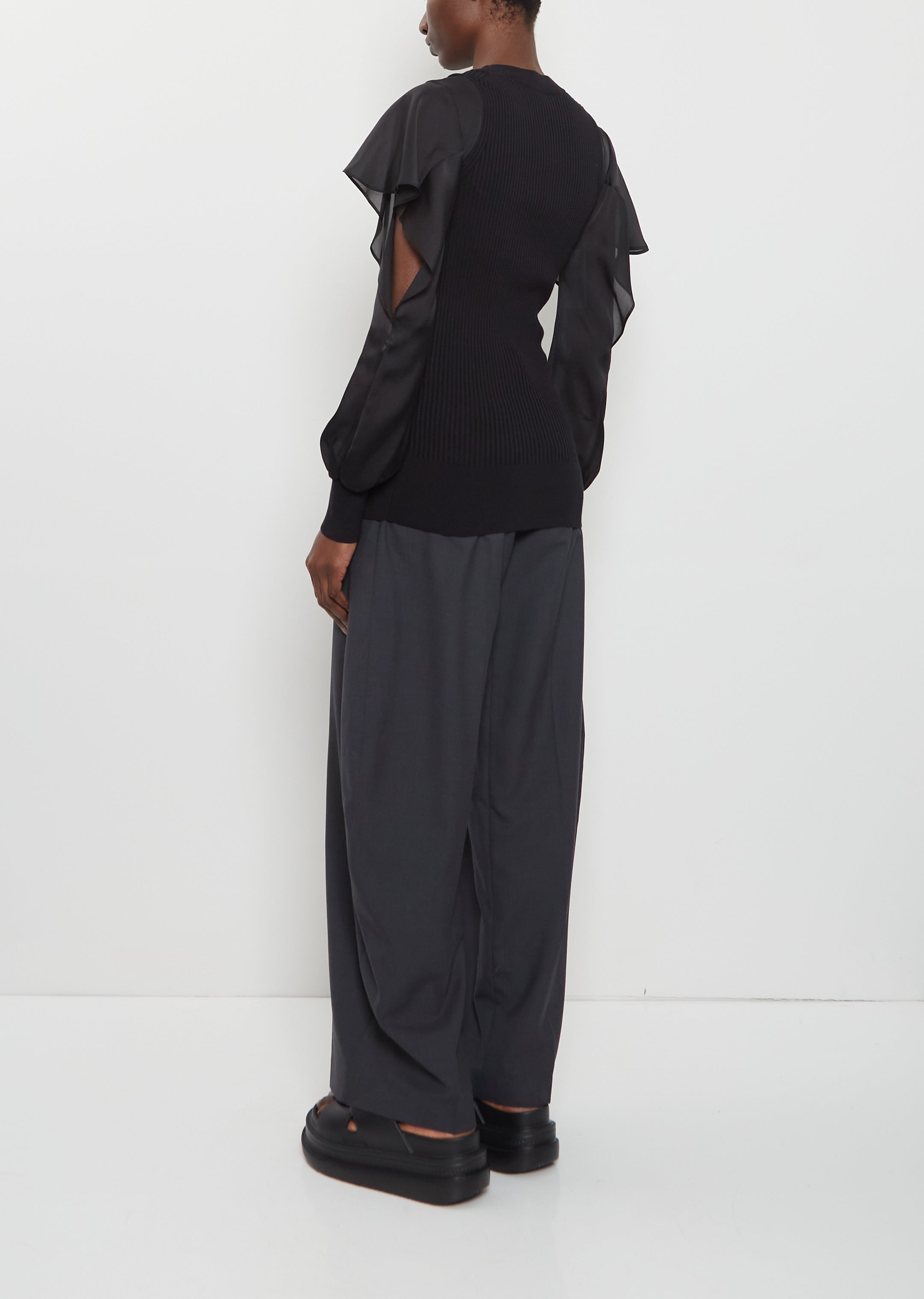 Sacai black pullover top with semi-sheer satin long sleeves with a side opening in mid-weight ribbed cotton knit. Features a round neck, an elongated bodice, and a thin ribbed trim at neck, cuffs and hem. Closer fit.