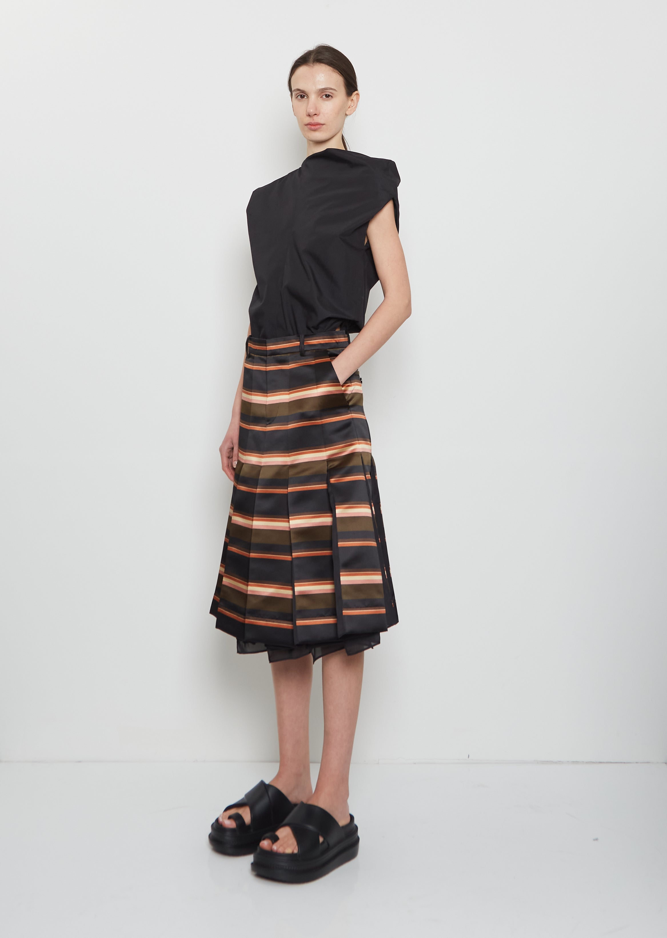 Sacai black paneled skirt with a tonal sheer cupro under-layer visible through panel slits in a smooth satin fabric with horizontal khaki and pink stripes. Features belt loops, angled pockets, buttoned welt pockets at back, an asymmetric hem and a hook and zipper closure at front.