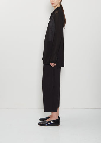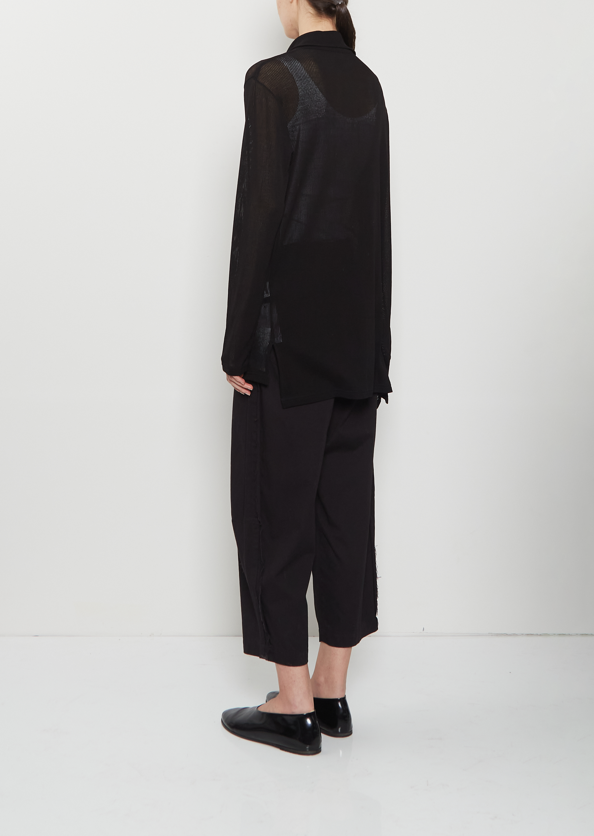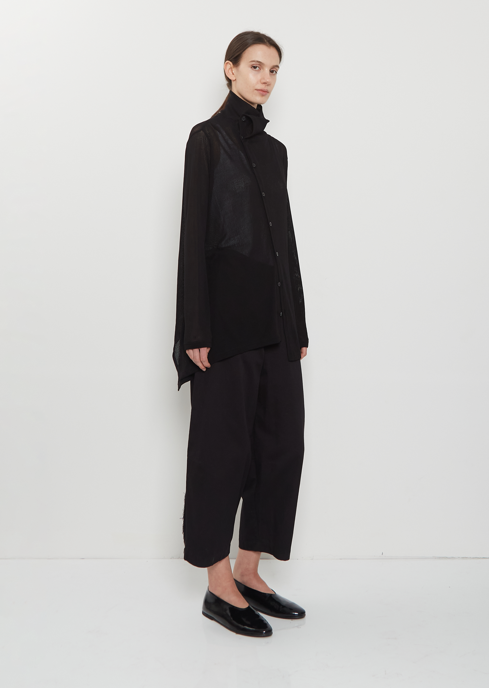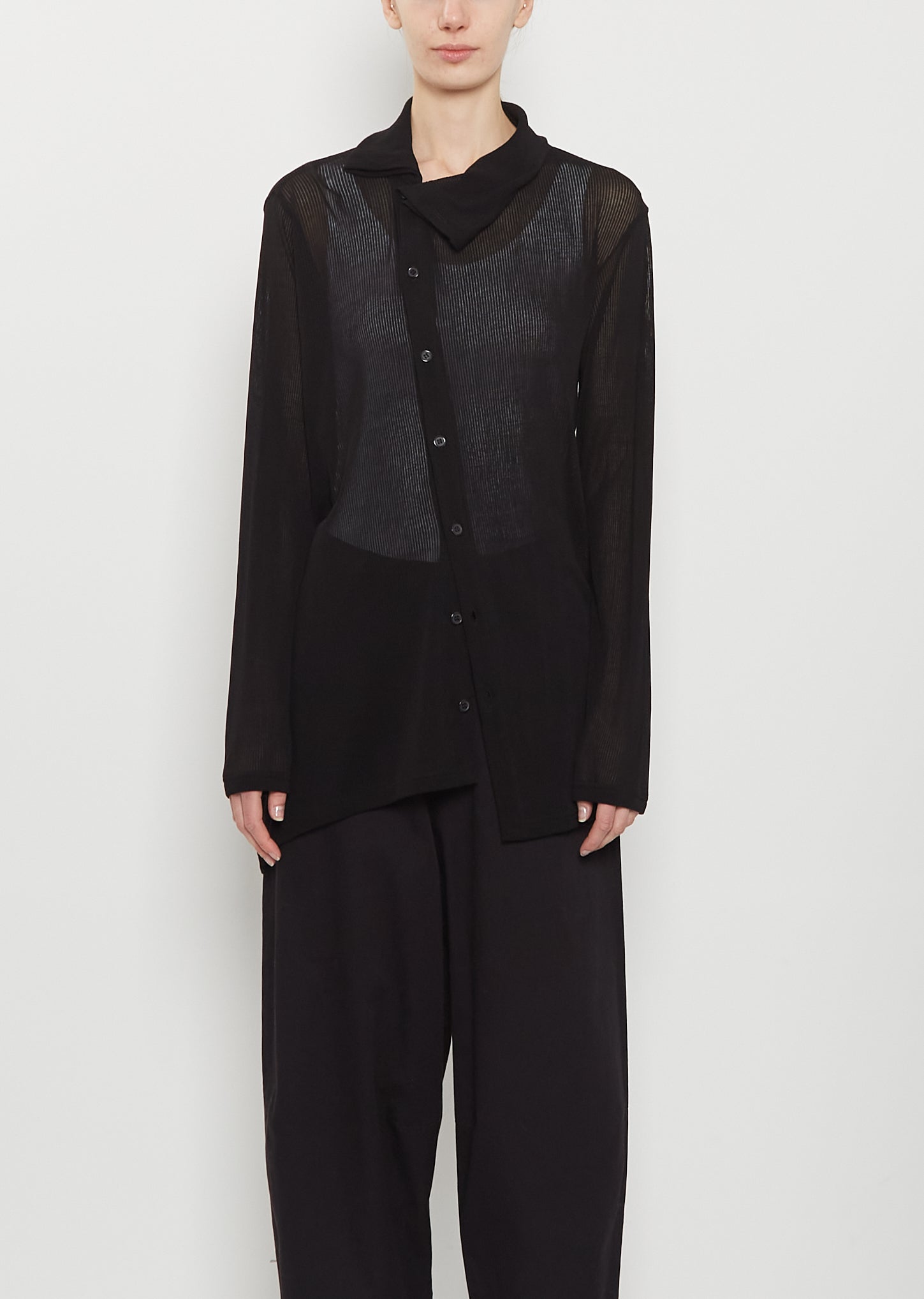 Y's black asymmetric cardigan with a high neck in semi-sheer lightweight ribbed cotton knit. features slightly dropped shoulders, an asymmetric hem and horn-hued buttons closure at front. Relaxed fit.