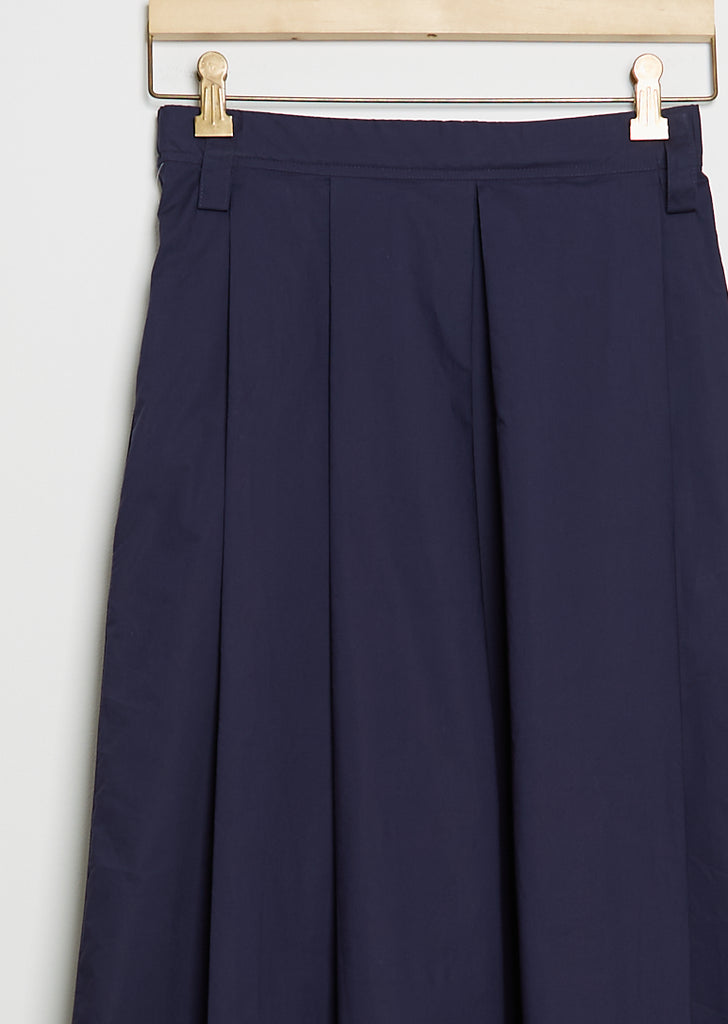 Sofie D'Hoore dark blue A-line skirt featuring box pleats at front and elasticated back waist in cotton. Belt loops. Concealed side seam pockets. Unlined. Pulls on.