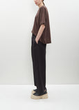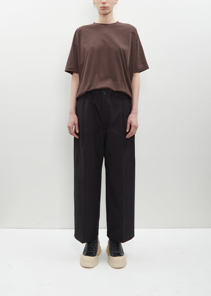 Sofie D'Hoore signature wide leg trousers with a pleated front and elasticated waist in off black mid-weight cotton. Features slash side pockets and a single welt back pocket. Button-through with tortoise-hue button and zip fly fastening. Detailed with belt loops. Relaxed fit.