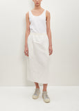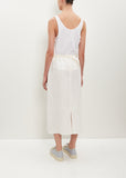 Sophie D'hoore signature straight skirt in soft white with a tonal grosgrain waistband and subtle shirring at waist in linen and cotton blend. Features a back slit and loose grosgrain ribbon at back waist. Concealed side seam pockets and center back zip-up fastening.