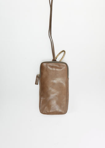Bea Mombaers olive green phone bag with a top zipper closure and a detachable clasp key ring. Features a long neck strap, an interior slip pocket and a press buttoned slip pocket at back. Comes lined in cotton canvas.