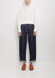 Casey Casey indigo pant with wide, straight legs in a robust cotton denim with a rinse wash finish. Features belt loop, 5-pocket construction, and button and zip-fly fastening. Finished with silver-toned hardware and contrast top stitching throughout. Comes uncuffed.