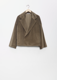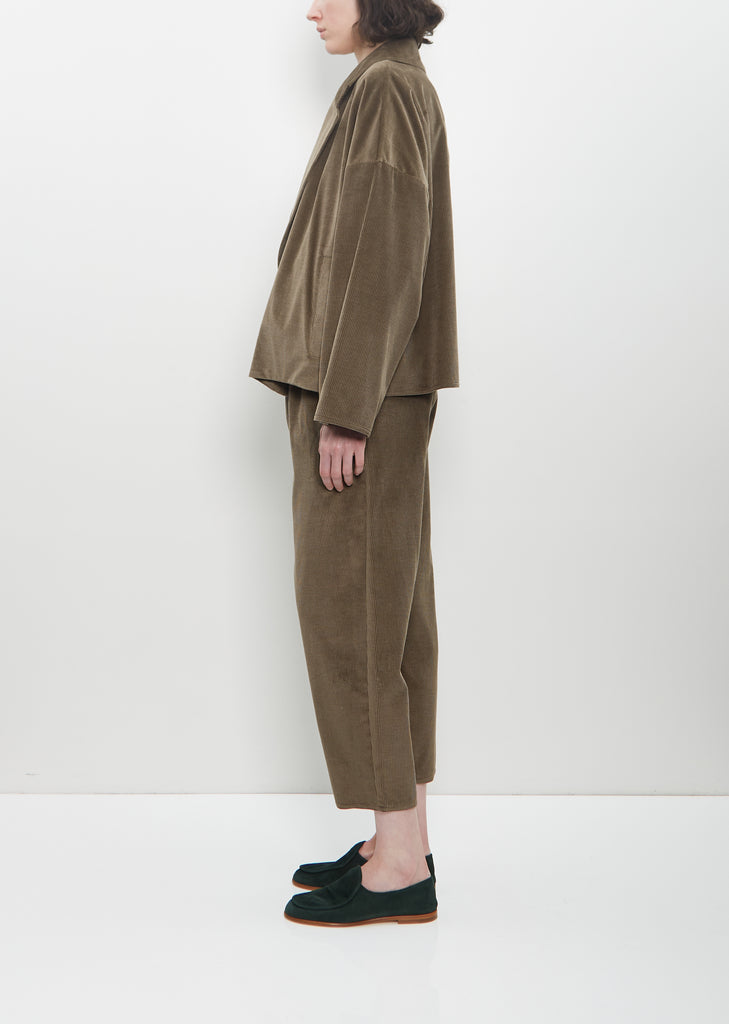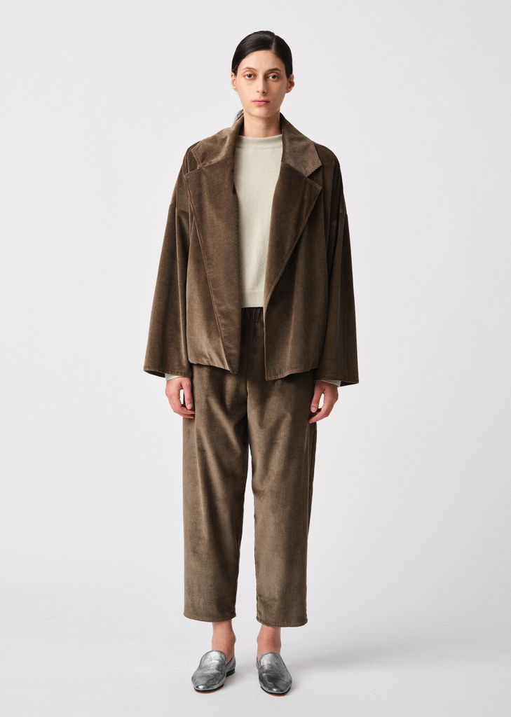 Dušan oversized blazer with an open front in military green cotton and silk blend corduroy. Features wide notched lapels, dropped shoulders and angled slip pockets. Comes partially lined in tonal corduroy.