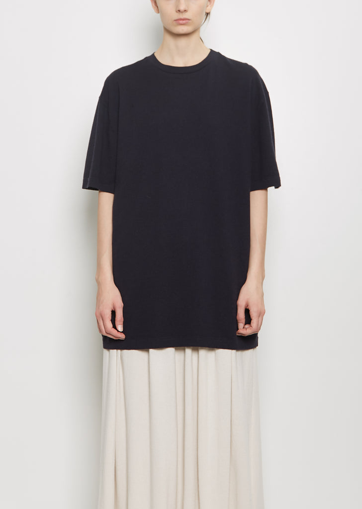 Extreme Cashmere navy relaxed fit tee with a round neck and dropped shoulders in soft and breathable cotton and cashmere blend knit. Finished with a rib trim at neckline.