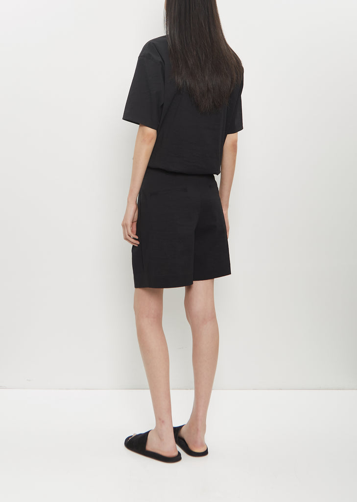 Issey Miyake black shorts with two front pleats and buckle adjusters at waist in textured stretch paper and cotton blend. Features belt loops, angled front pockets, welt pockets at back, and a button and zip-fly fastening.