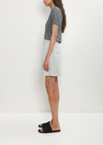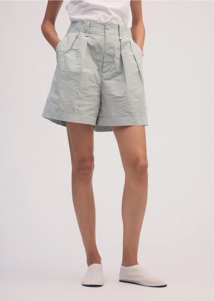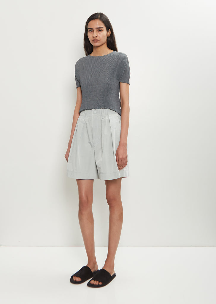 Issey Miyake light green ash short with two front pleats and a press button and concealed zipper closure in a technical poly cotton blend with a crinkle texture. Features belt loops, angled pockets, and welt pockets at back.