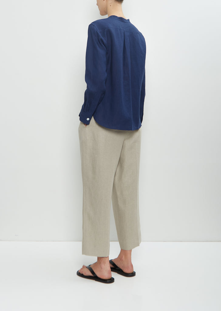 Margaret Howell deep blue collarless shirt with a round neckline and raised buttoned placket in crisp linen woven in Ireland. Features buttonhole detailing at collar band, buttoned cuffs, curved hem with gusset, and box pleat at back yoke. Regular fit.