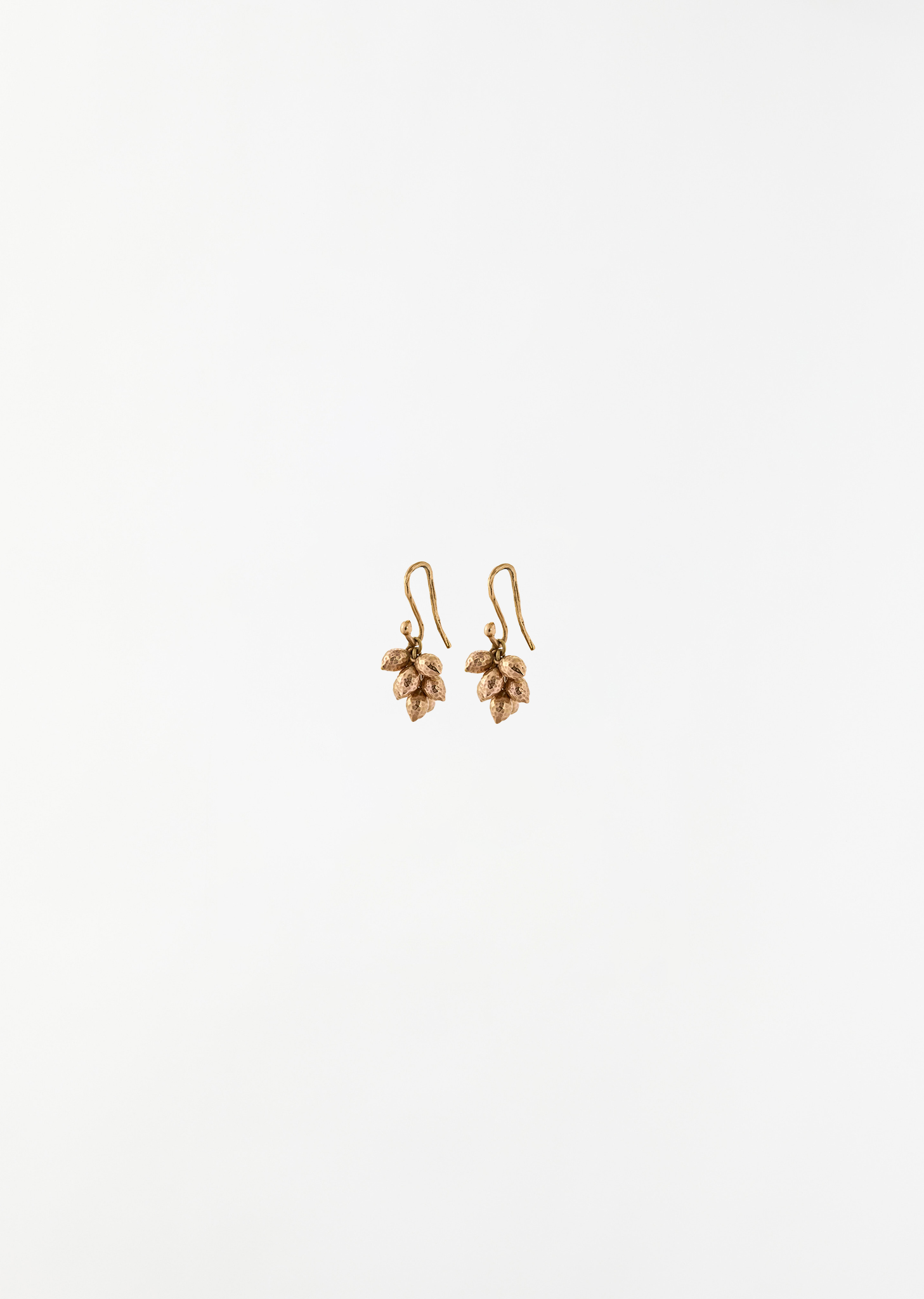 Mira Stella sea kale seed earrings made to scale mounted on a fish hook back with oak bark texture in 18-carat rose gold. Features seven rose gold sea kale beads. The elements are mobile, making the jewelry look more natural.