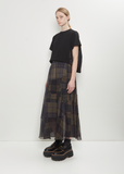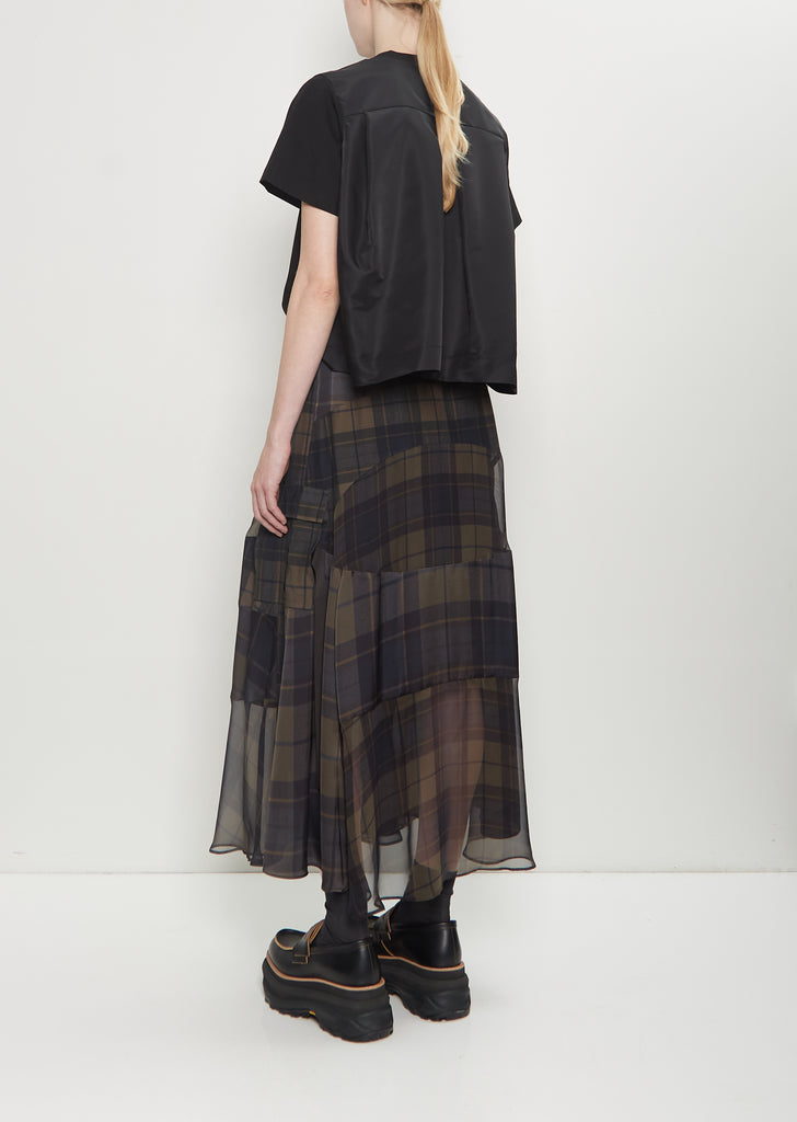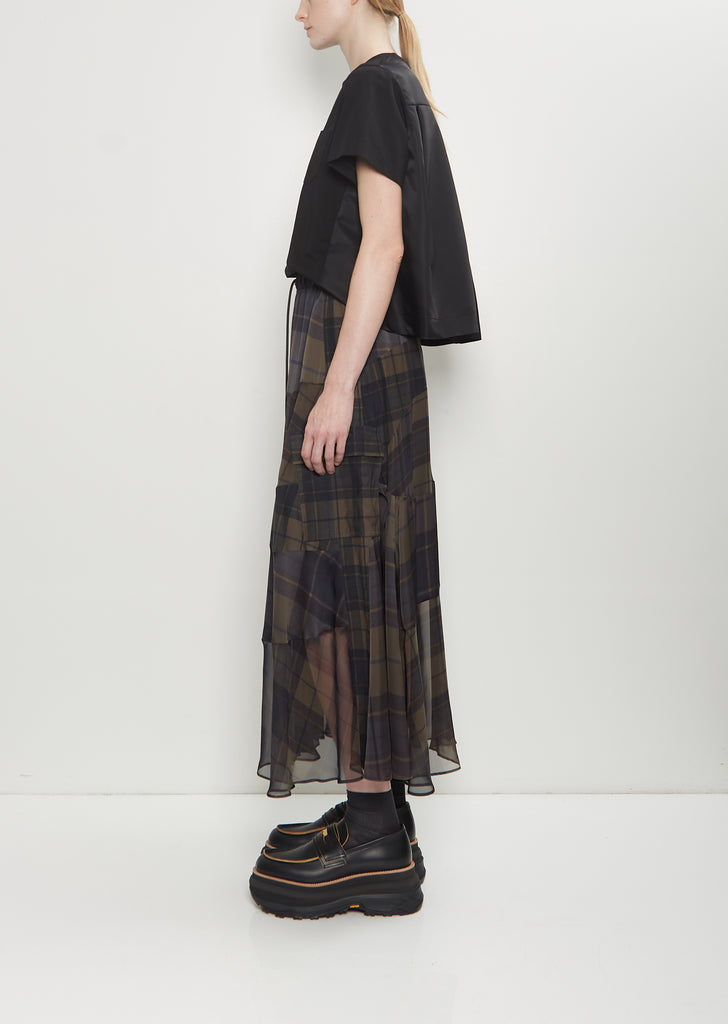 Sacai khaki and navy plaid patchwork skirt with an elasticated waist and adjustable drawstring in cotton blend and sheer voile panels. Features gathered waist, press buttoned flap pockets at sides, and grosgrain ribbon attachments at sides. Half lined in black cupro fabric.